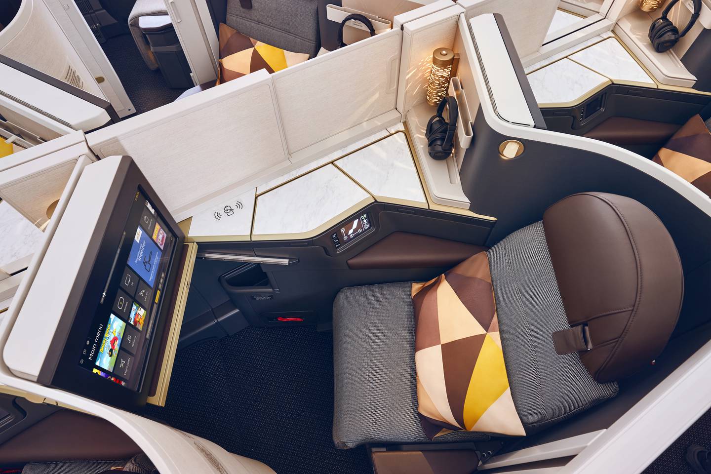 비즈니스 스튜디오는 1-2-1 배열로 전 좌석이 통로를 향해 있습니다.