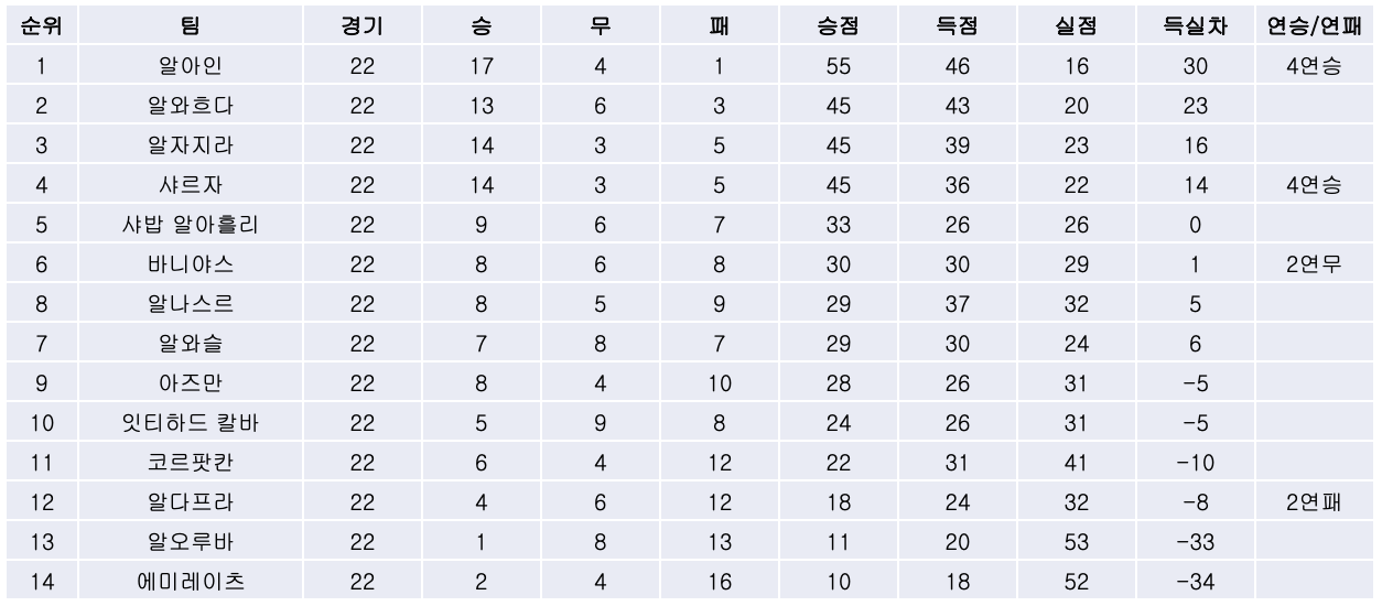4) 아챔에서 당초 목표였던 2위 대신 초라하게 조별예선에서 탈락했던 샤르자는 승격 첫 시즌에 강등이 유력해진 알오루바와의 경기에서 5대0 대승을 거둔데 이어, 승점 6점짜리 경기였던 알와흐다와의 경기에서 벤 말랑고의 멀티골로 역전승을 거두고 4연승을 달리며 리그 2위 알와흐다와 같은 승점 45점으로 준우승 경쟁을 더욱 피말리게 만들었습니다.