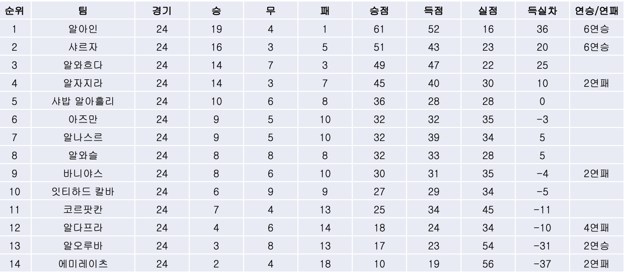 4) 이번 시즌 승격팀이자 리그 하위권으로 리그 잔류의 희망을 살리기 위한 승점 6점이 걸린 단두대 매치에서 알오루바가 홈팀 에미레이츠를 0대1로 꺾고 남은 두 경기에서 알다프라와 리그 잔류를 놓고 겨루게 되었습니다. 한편, 패한 에미레이츠는 남은 경기에 상관없이 최하위를 확정지으며 승격 한 시즌만에 다음 시즌 강등이 확정되었습니다.