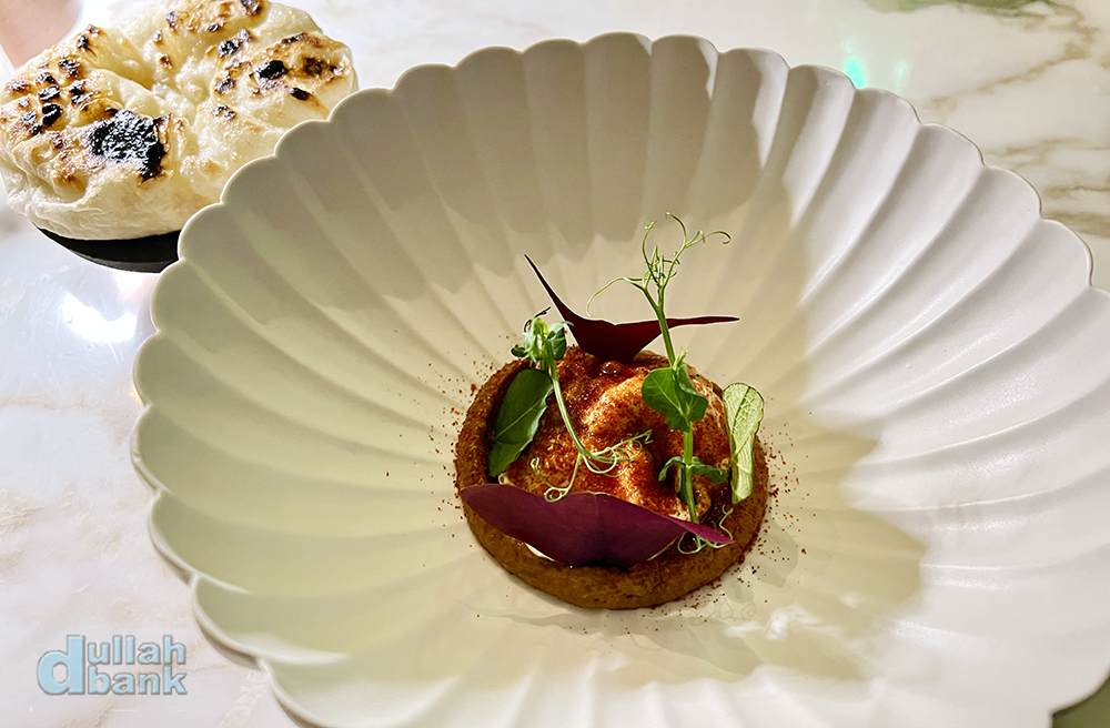 셰프가 두바이에서 태어나 자랐지만 시리아인임을 보여주는 메뉴로 시리아 알렙포에서 기원한 것으로 알려진 무함마라에 알렙포산 칠리와 샤워도우 미소를 섞어 유자가 가미된 스트라치아텔라을 얹었으며, 숯에 직접 구운 쿱즈와 함께 제공됩니다.