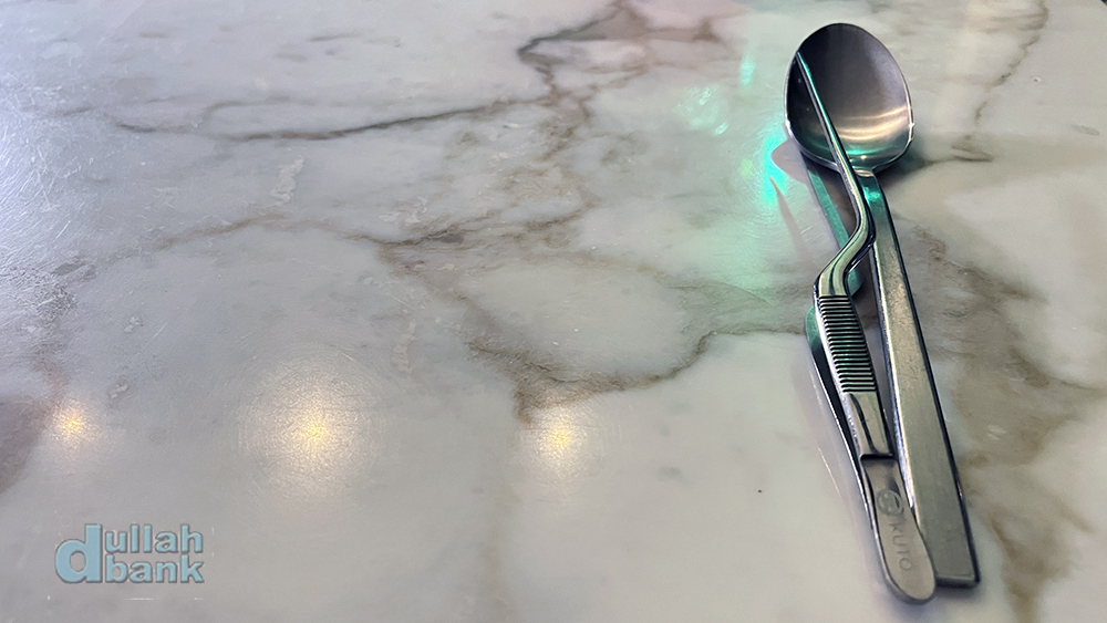 메뉴가 나오기 전 스푼과 함께 젓가락.... 아니 특이한 모양의 핀셋이 함께 나오는 점이 인상적이었습니다.