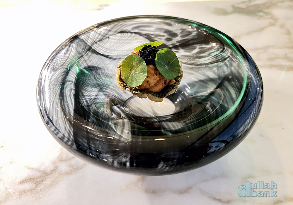 노리 튀김 위에 새끼 방어 타르타르, 유자 드레싱, 블랙 트러플 캐비어가 얹어져서 제공됩니다.