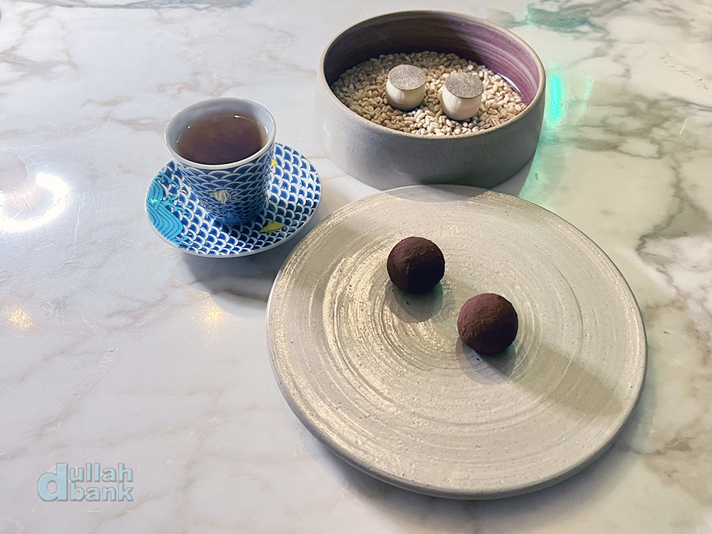 마지막 메뉴는 꿀과 바닐라 가나슈 트러플에 속을 편하게 해주는 호지차가 함께 제공됩니다. 호지차 역시 무한 리필 가능.
