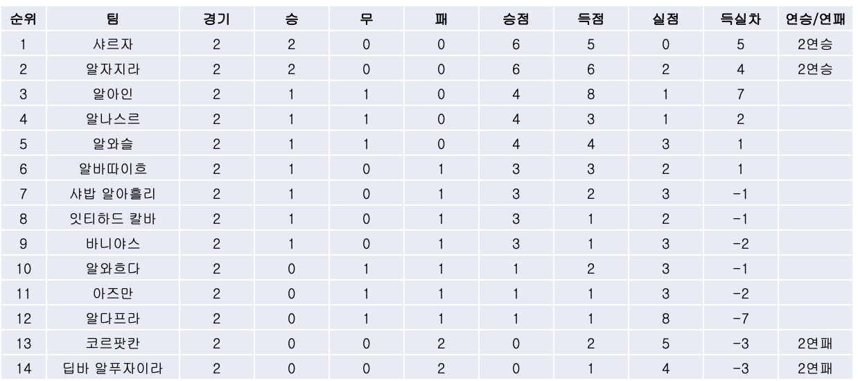| [22/23 APL 4R] 4연승으로 선두를 달린 샤르자, 승격팀 알바따이흐에 대승을 거두며 첫 승을 신고한 알와흐다! (0) | 2022.10.03 |