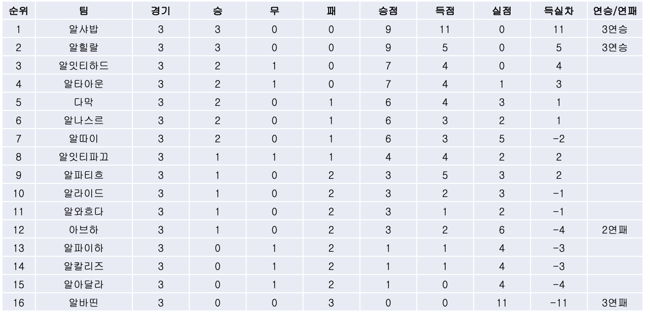 3) 김승규 풀타임 클린시트. 2연승을 달리고 있는 알샤밥은 지난 시즌 개막 초반 부진에서 벗어나 이번 시즌 의외로 2연승을 달리고 있는 알따이와의 경기에서 크리스티안 구앙카의 멀티 결승골과 아론 부펜자, 카를로스의 골을 묶어 4대0 대승을 거두고 알힐랄과 마찬가지로 클린시트 3연승을 달렸지만, 세 경기에서 무실점 11골을 뽑아내는 공격력을 과시하며 골득실에서 앞서 리그 선두를 유지했습니다. 풀타임을 소화한 김승규는 어김없이 클린 시트로 골문을 지키며 팀 연승행진에 기여했습니다. 알샤밥은 다음 라운드에서 리그 초반 4경기 무실점이라는 구단 역사상 전무후무한 기록에 도전하게 됩니다.