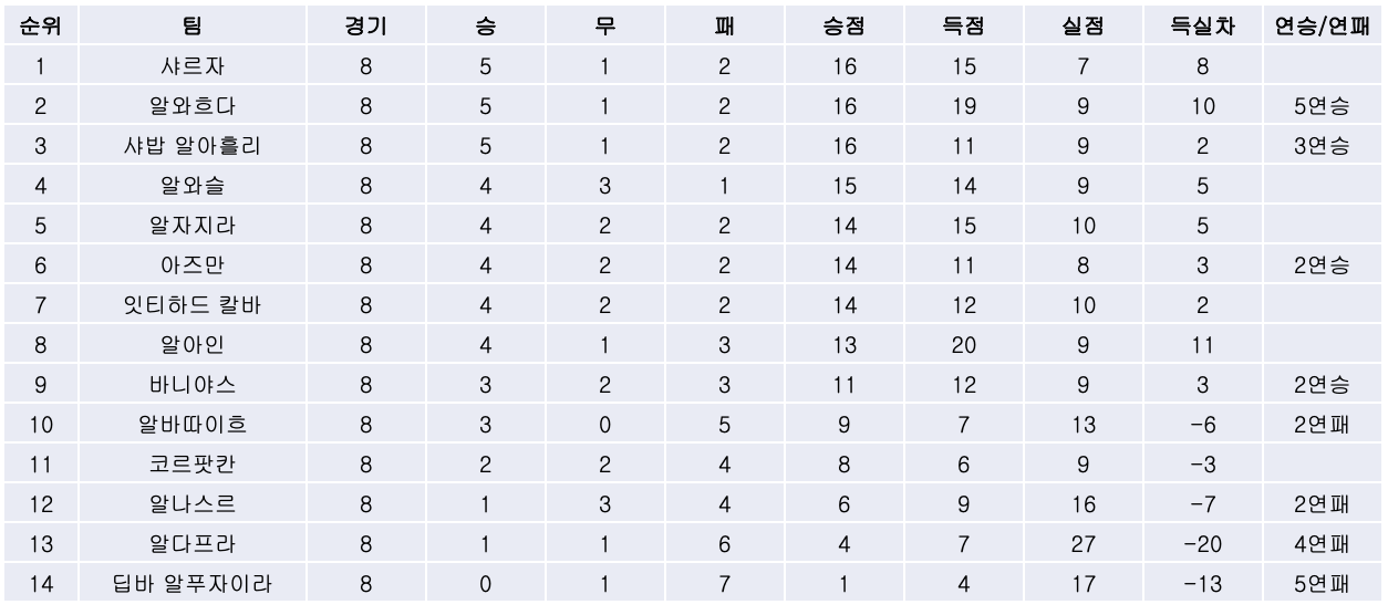 1) 최근 2연패의 부진에 빠져있던 알자지라는 유일하게 무패를 달리던 알와슬과의 홈경기에서 아슈라프 벤 샤르끼의 멀티골을 앞세워 2대0으로 승리하며 연패에서 벗어났습니다. 7라운드까지 유일한 리그 무패팀이었던 알와슬은 여덟 경기 만에 첫 패배.