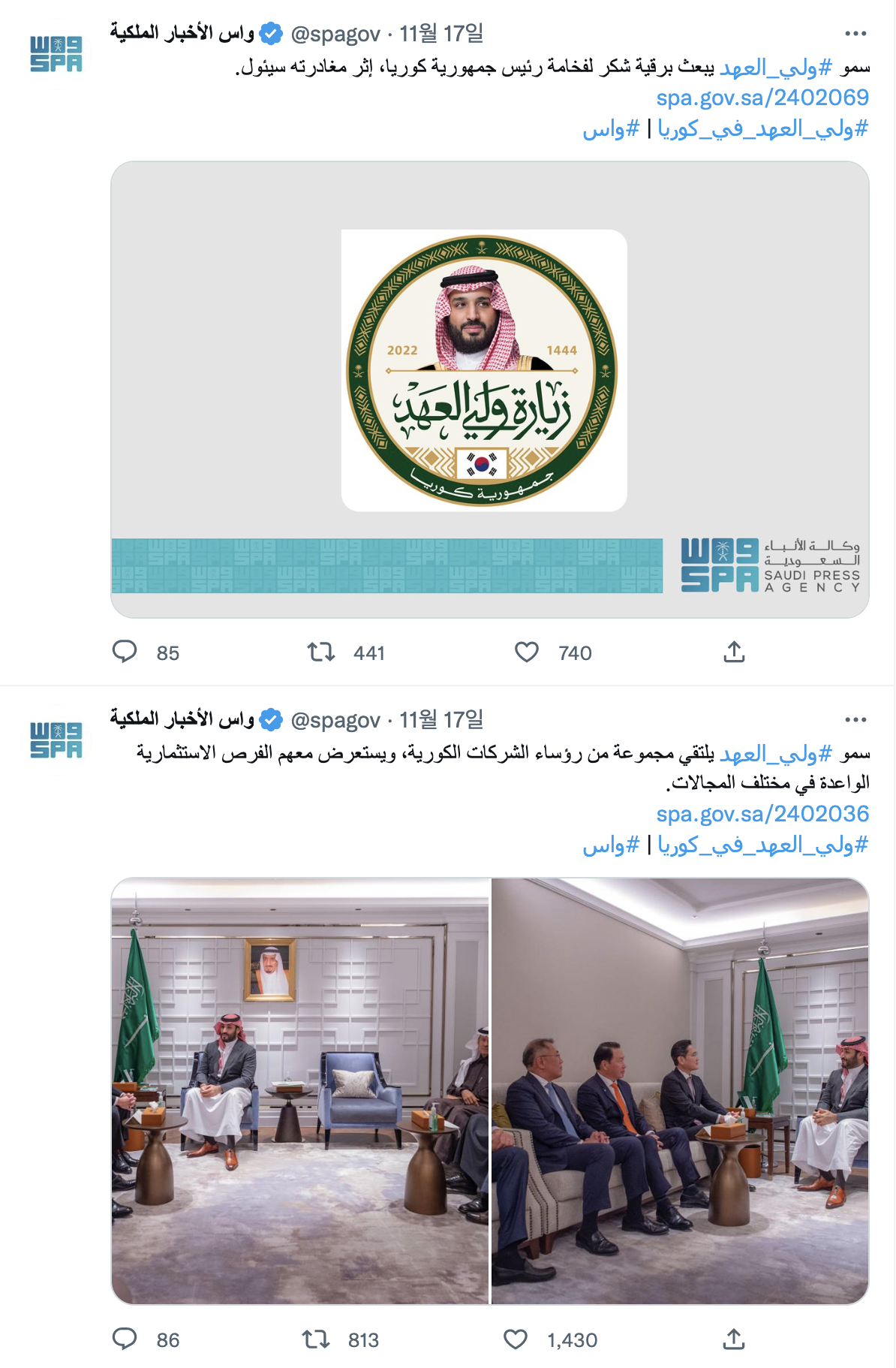 덧, 입국 영접이 얼마나 허접했었는지를 위에서 비교 설명해드렸는데, 출국 영접은 더 허접했던 것으로 보입니다. 사우디 관영통신 공식 SNS에 소개된 방한 소식은 재벌 총수를 만났다와 사진 하나 없이 대통령에게 감사 전보를 보냈다...가 전부였으니까요.