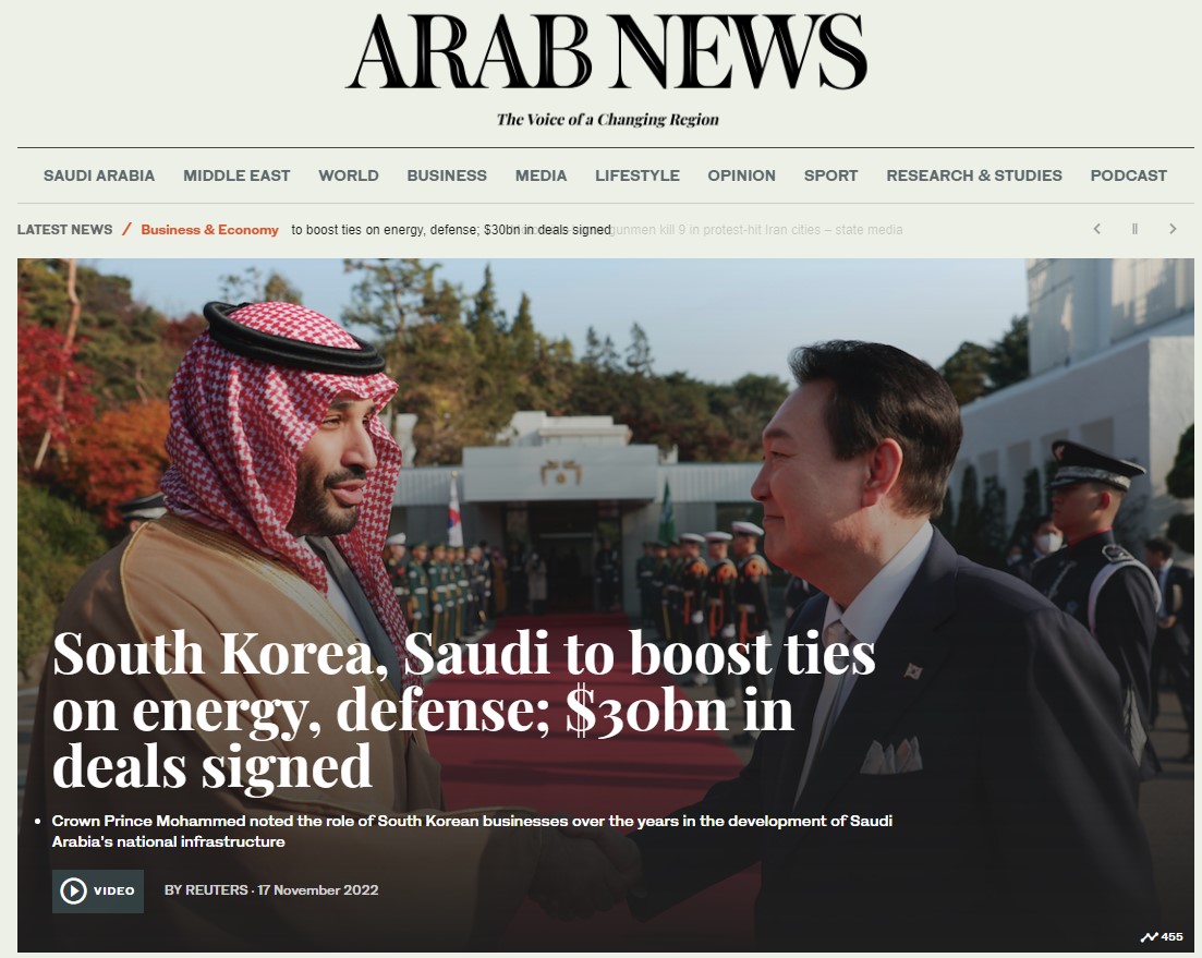 무함마드 왕세자와 한덕수 총리의 만남은 17일자 사우디 영자 신문지의 1면을 장식합니다.