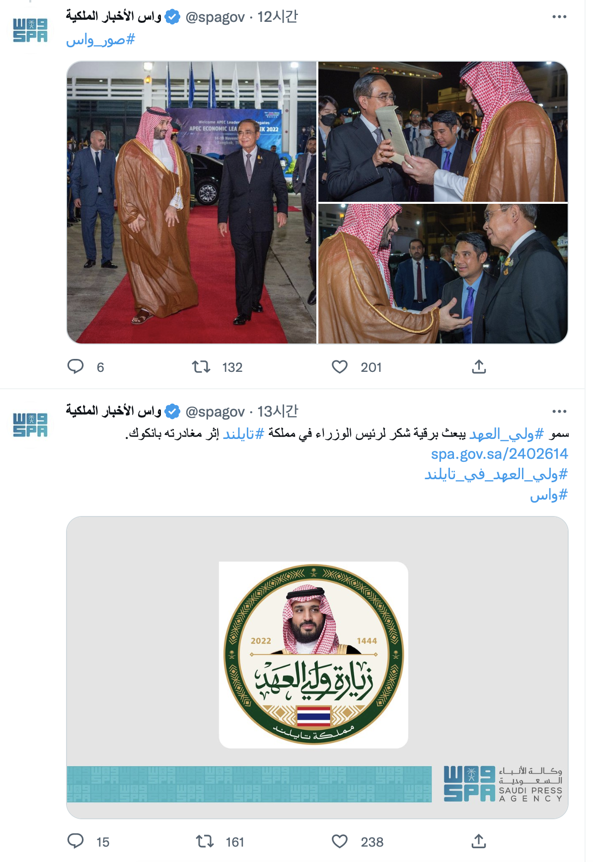 태국은 1989년 발생한 "블루 다이아몬드 도난 사건"으로 사우디와 국교가 단절된지 33년만인 올해 초에 무함마드 빈 살만 왕세자의 초청으로 쁘라윳 짠오차 총리가 사우디를 방문하면서 간신히 정상화된 바 있습니다. 즉, 태국 입장에선 비록 APEC에 참석하기 위한 방문이었을지라도 무함마드 빈 살만 왕세자가 수십년 만에 태국을 방문한 사우디 최고위급 인사가 되었죠. 태국행에 동반한 사절단 명단을 보니 한국을 방문했던 사절단에 비해 규모가 다소 줄어들긴 했지만요.