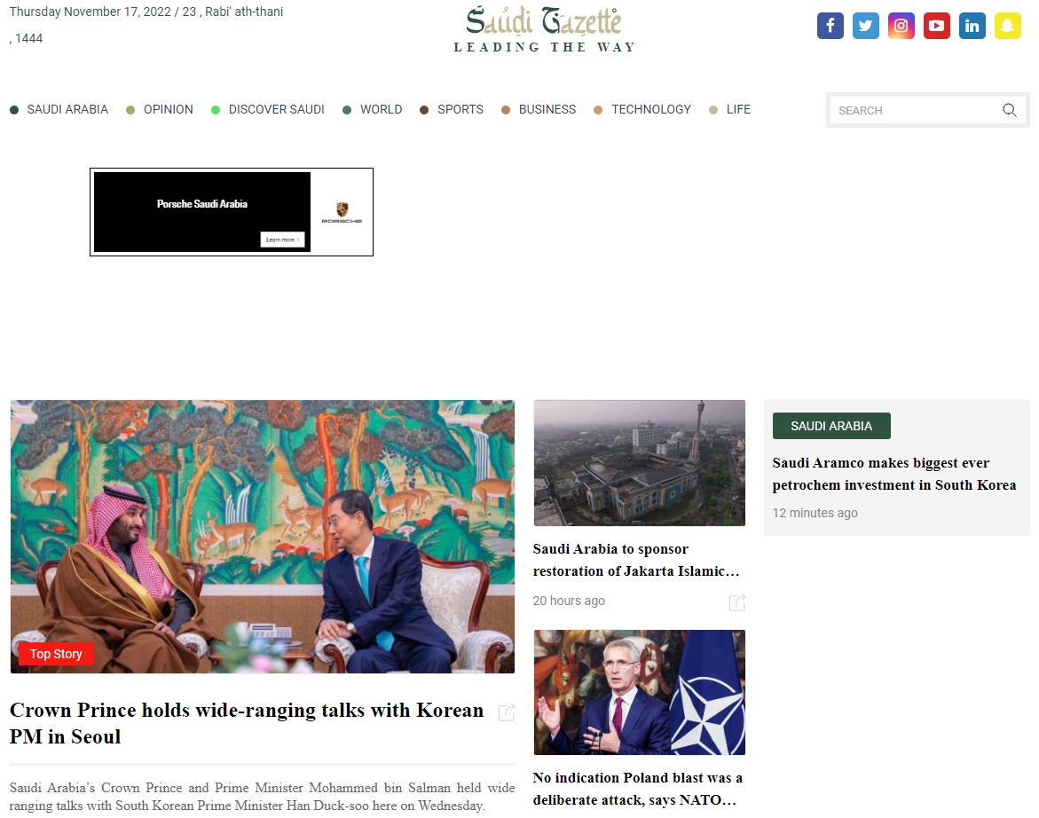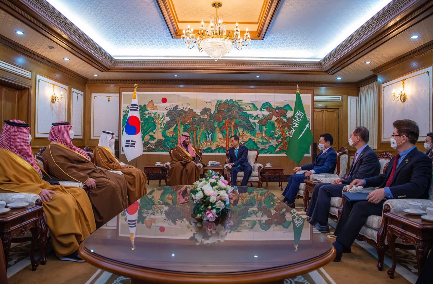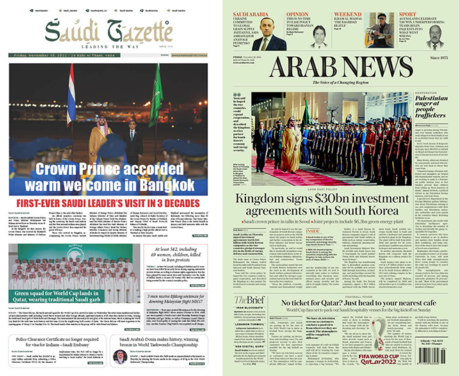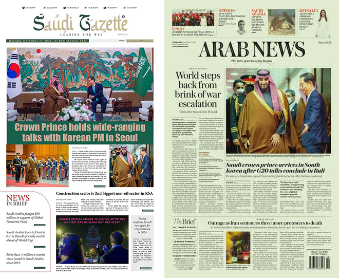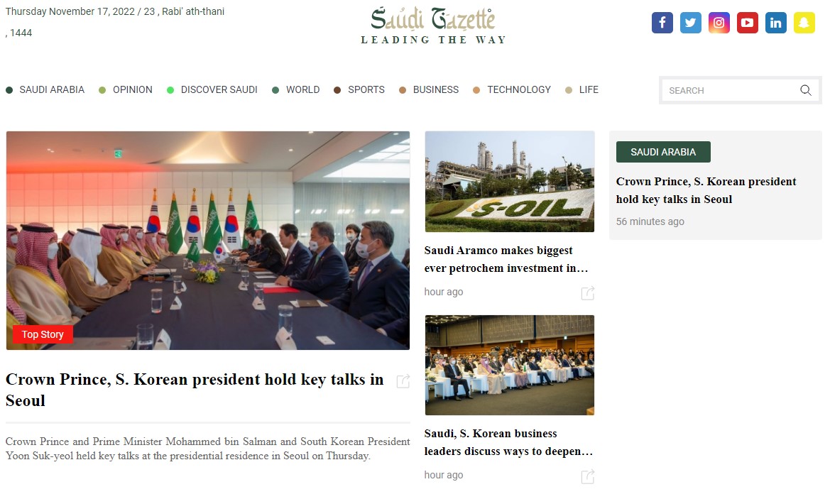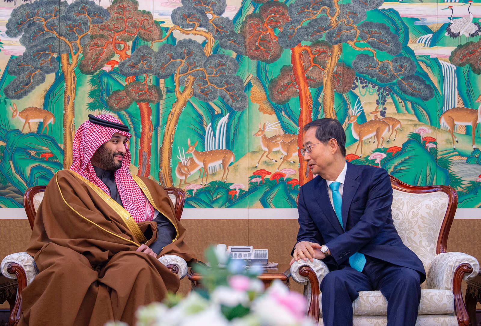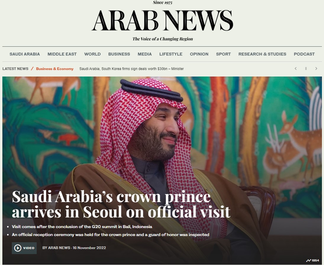무함마드 왕세자와 한덕수 총리의 만남은 17일자 사우디 영자 신문지의 1면을 장식합니다.