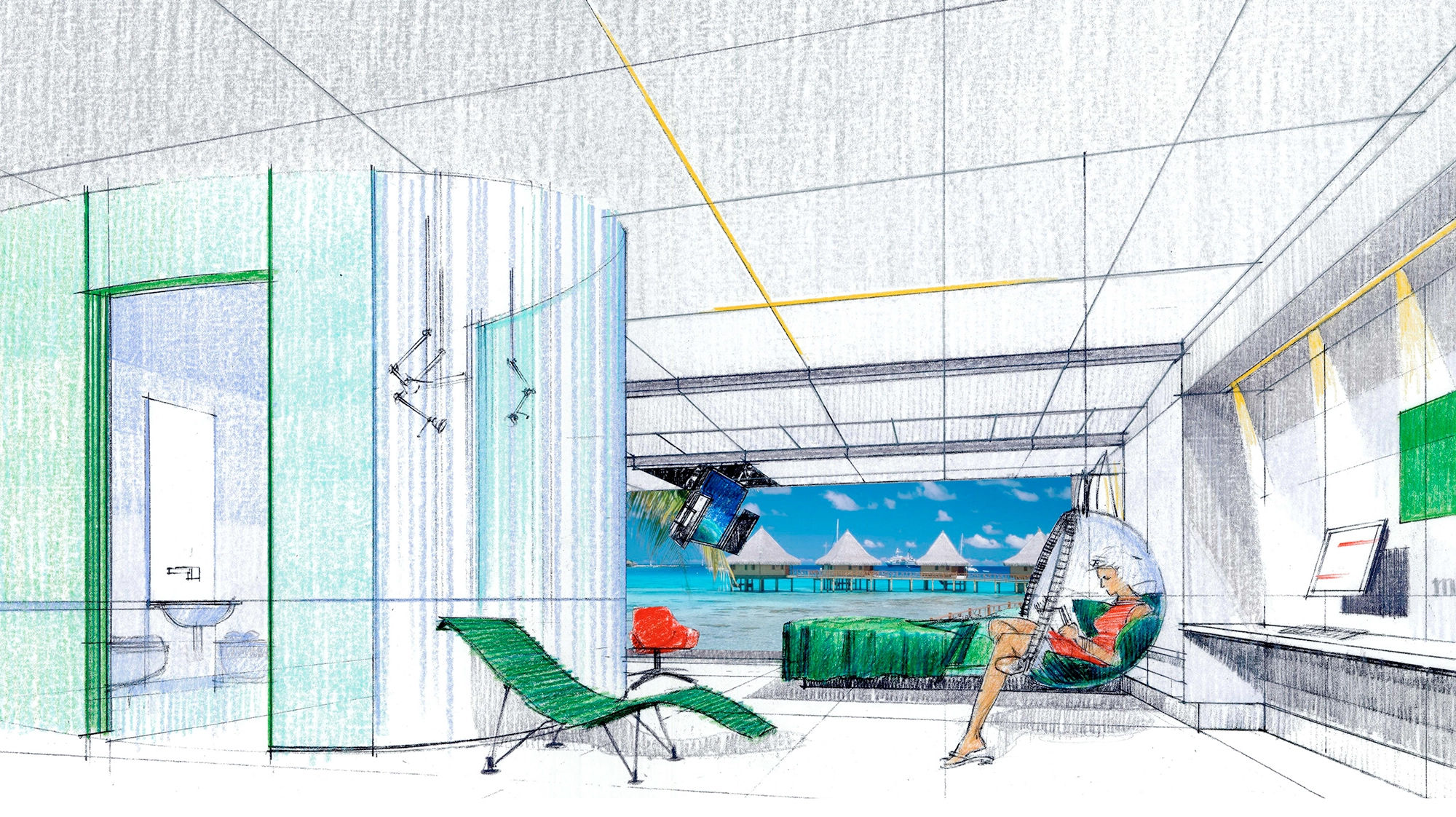 건물의 디자인 시안에서 보여지듯 객실내 모든 방에는 전통적인 개념의 창이 없는 대신, SF 영화에서 본 것처럼 대형 스크린을 활용해 투숙객의 취향에 맞는 뷰를 제공하게 됩니다.