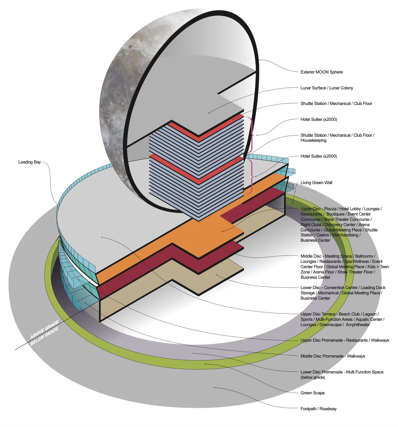 주거공간이 들어설 부분의 빈 공간을 활용해 인공 달 표면으로 올라가는 초고속 셔틀을 설치해 긴급 메디컬 체크, 보안 스크리닝, 각종 브리핑을 받고 타게 만들어 진짜로 달에 가는 듯한 체험을 제공할 계획을 갖고 있습니다.