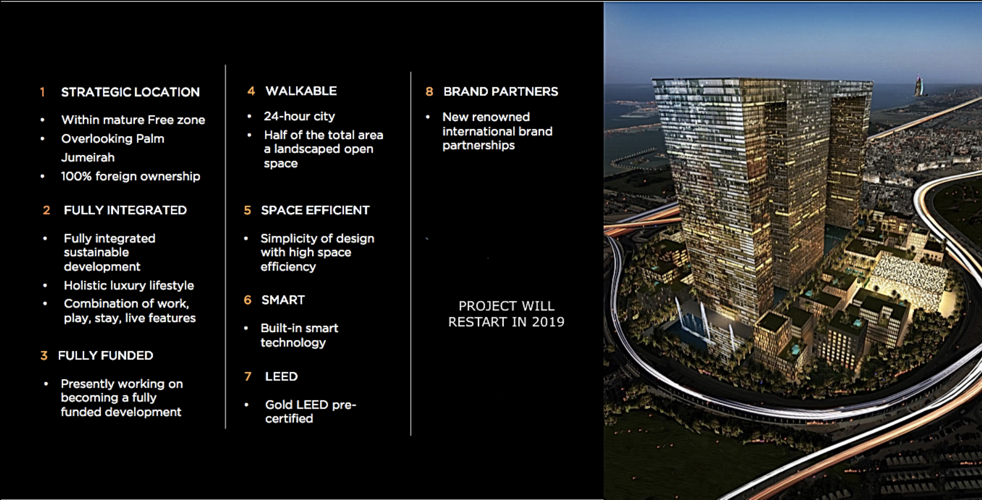 옴닉스 그룹이 2200만 평방 피트의 부지 위에 300미터 높이의 73층짜리 건물 네 동과 부대 건물을 조성해 1,490채의 아파트, 5성급 호텔 일곱개, 60개 이상의 식당, 1,600석 규모의 극장이 들어서는 다목적 단지로 조성하겠다며 2002년에 발표한 야심찬 프로젝트로 당시 건설 붐이었던 UAE에서도 초대형 프로젝트 중 하나였습니다. 하지만, 2009년 착공에 들어가자마자 찾아온 두바이 경제 위기 속에 공사가 중단되면서 좌초되기 시작했습니다.