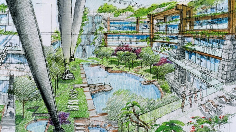 문 월드 리조트가 공개한 리조트 내부의 디자인 시안은 보다 미래지향적입니다. 대안 우주여행 리조트라는 컨셉에도 맞지만, 무엇보다 햇빛이 넘쳐나는 이 도시 속에 세워지는 건물임에도 건물 자체에 외부에서 빛이 거의 들어오지 않는 태생적인 한계를 극복해야 하니까요.