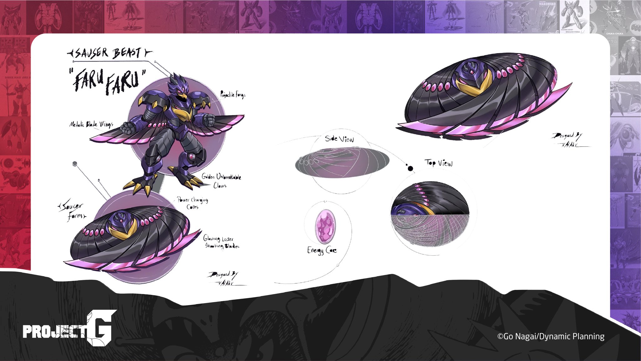 망가 프로덕션은 프로젝트G 공식 발표와 함께 총상금 1만 5천 달러 (1등 1만 달러, 2등 4천 달러, 3등 1천 달러)를 걸고 1등으로 선정된 원반수를 그렌다이저 신작에 출연시키는 원반수 디자인 공모전을 개최합니다. 심사 위원은 원작자 나가이 고, 잇삼 부카리 망가 프로덕션 CEO, 나가이 이치나오 다이나믹 플래닝 프로듀서