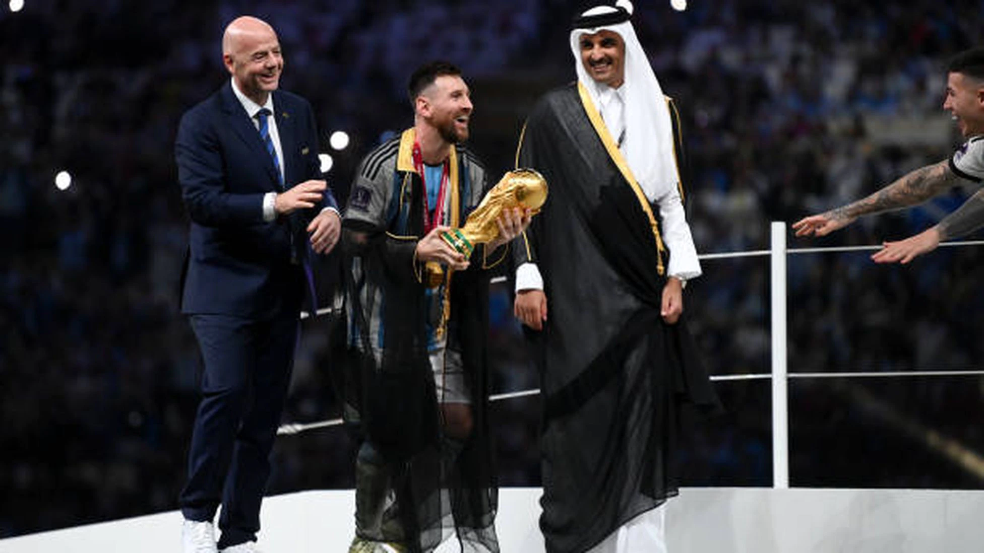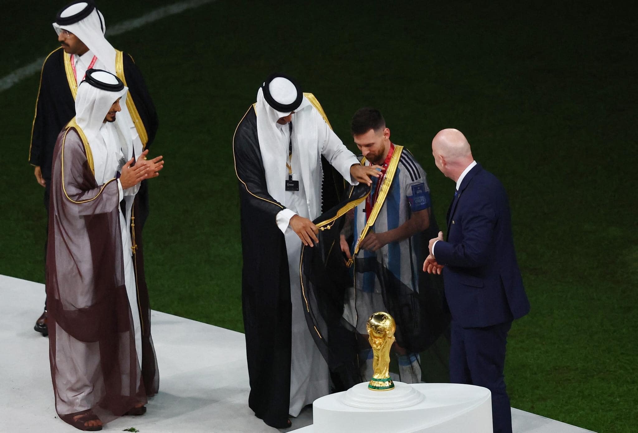 월드컵 역사에 길이남을 역사적인 결승전 후 월드컵 우승 메달을 목에 걸고 트로피를 향하던 메시에게 카타르 통치자 셰이크 타밈이 금빛과 검은색의 망토를 입혀주면서 카타르 월드컵을 비난하던 이들에겐 또다른 비난 및 논쟁 거리가 되었습니다.