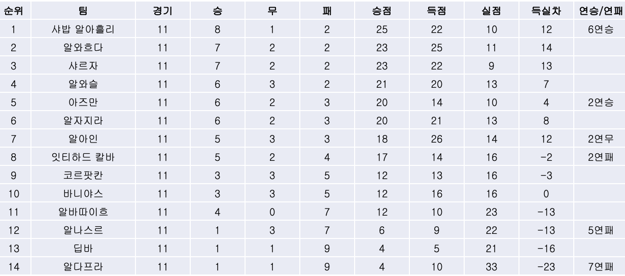 | [22/23 APL 12R] 샤르자, 상위권들의 부진 속 세 라운드 만에 리그 선두 탈환해! (0) | 2022.12.27 |