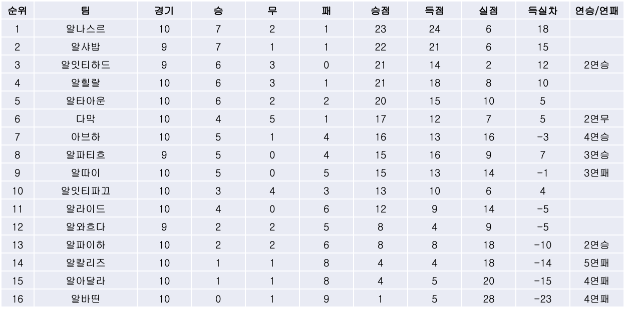 4) 장현수 풀타임 1경고. 알나스르와 알힐랄의 리야드 더비에서는 알나스르가 경기를 주도하고도 크로스바를 두 번이나 강타하는 불운 속에 알힐랄에게 리드를 허용하며 끌려다니다 결국 혼전 상황에서 흘러나온 볼을 그대로 골로 연결시킨 압둘라흐만 가립의 동점골로 승점을 1점씩 나눠가졌습니다. 이겼으면 선두에 오를 수 있었던 알힐랄에게는 아쉬운 결과지만 라이벌 알나스르의 5연승을 저지한 것에 만족해야만 했습니다. 기어코 승부를 원점으로 돌린 알나스르는 지난 라운드에 이어 두 경기 연속 리그 선두를 유지했습니다. 현재 월드컵에 차출된 상당수 주전 선수들이 부상으로 전력에서 열외되며 정상적인 전력을 구축하기 힘든 알힐랄은 경기 도중에도 일찌감치 아웃된 무함마드 알브라이크에 이어 안드레 카리요까지 부상으로 교체아웃되며, 알나스르의 기세를 제어하기엔 역부족이었습니다. 이번 시즌에는 새 선수 영입이 불가하기에 갖고 있는 전력으로 시즌을 이겨내야 합니다.