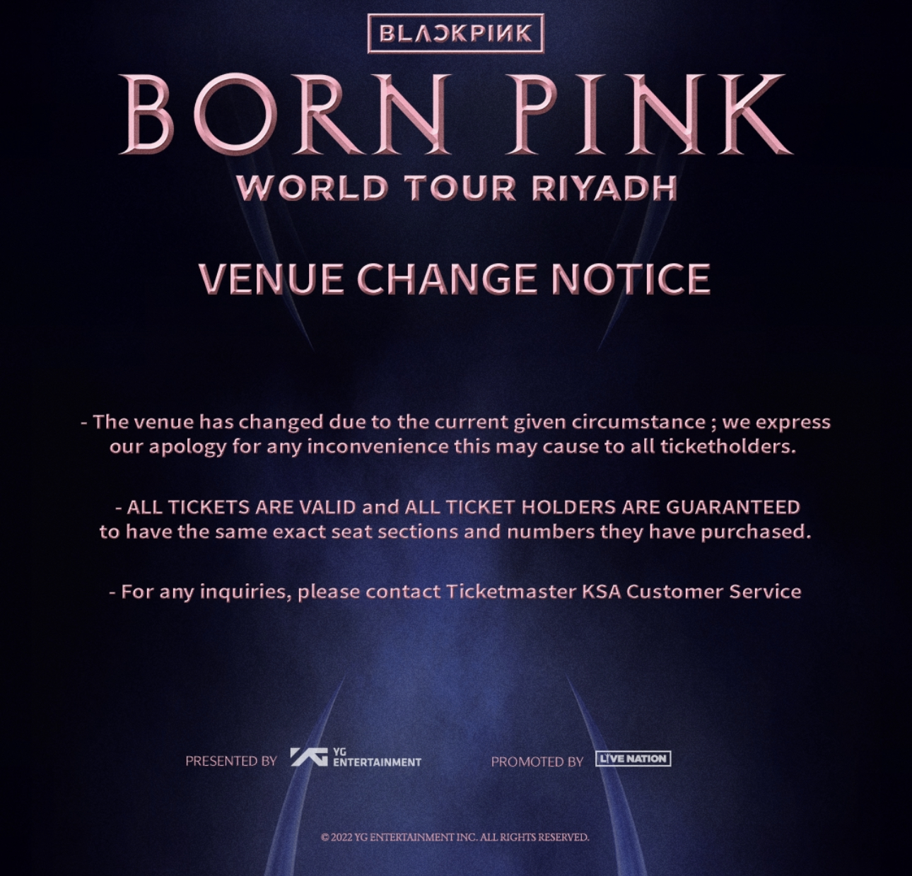 블랙핑크의 리야드와 아부다비 콘서트의 프로모터인 라이브 네이션은 콘서트를 8일 앞둔 12일 오후 긴급 공지를 통해 무르술 파크에서 열리기로 되어있던 블랙핑크의 콘서트장이 당초 예정되었던 무르술 파크에서 불바르 인터내셔널 페스티발 사이트 (Blvd International Festival Site)로 전격 변경되었다고 발표했습니다.