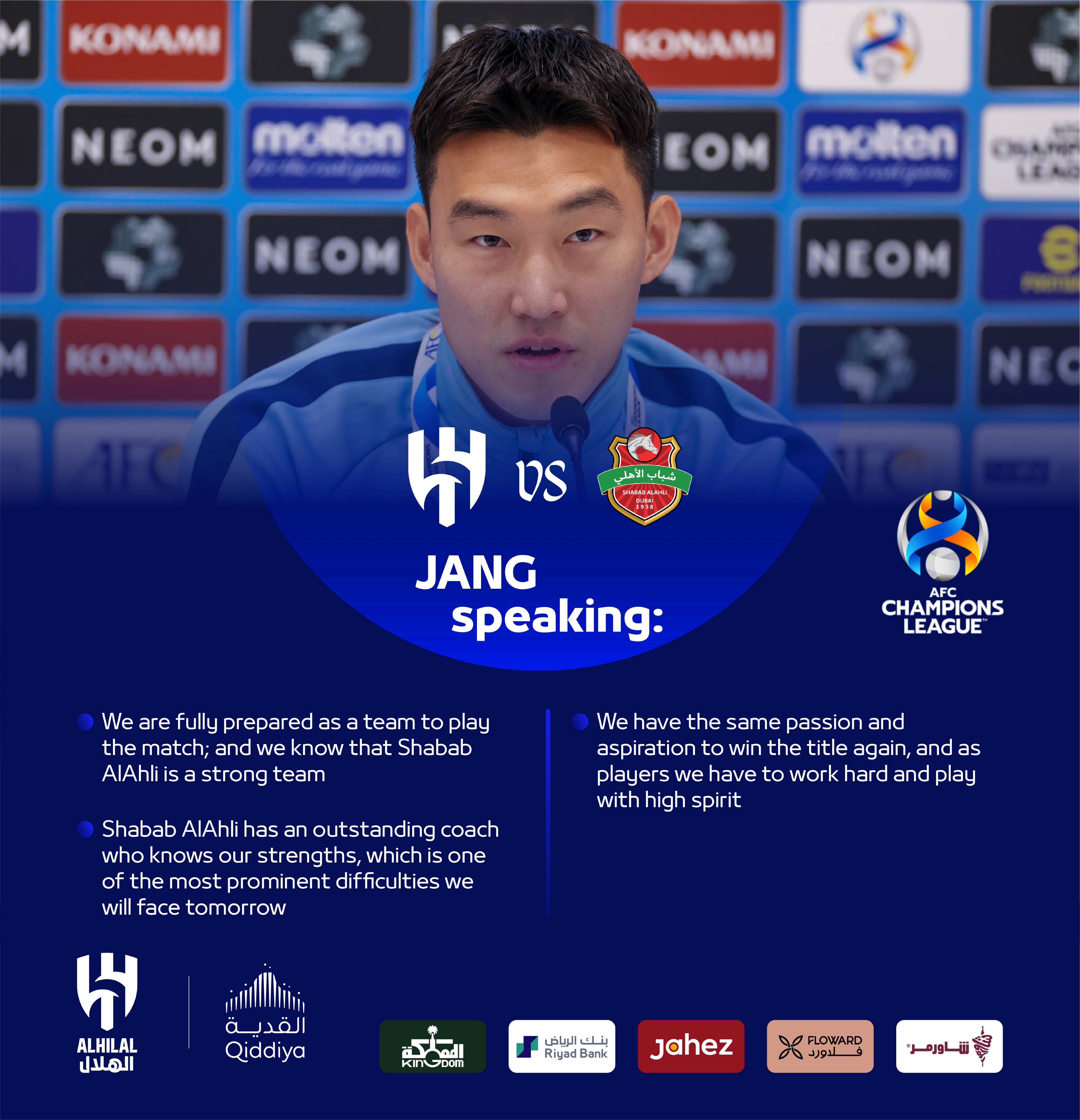 5) 장현수는 라몬 디야즈 감독과 함께 프리 매치 프레스 인터뷰에 알힐랄 선수 대표로 참석했습니다.