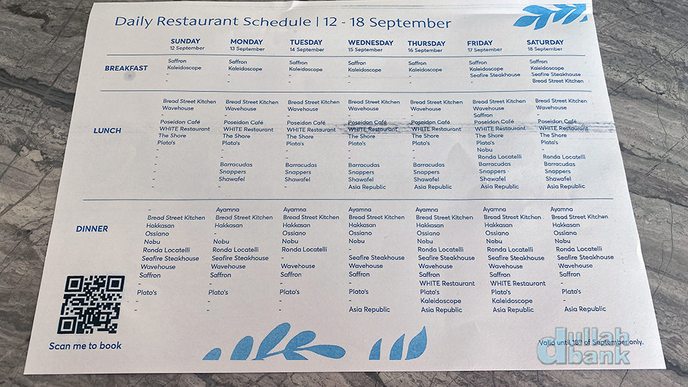 하프보드 투숙객을 위한 안내도 포함되어 있죠. 아침 저녁을 같은 식당에서 제공하는 곳도 있지만, 아틀란티스 더 팜은 선택의 폭이 넓은 대신 투숙비에 포함된 식대 외에 추가요금을 과금하는 레스토랑도 당연히 있습니다.