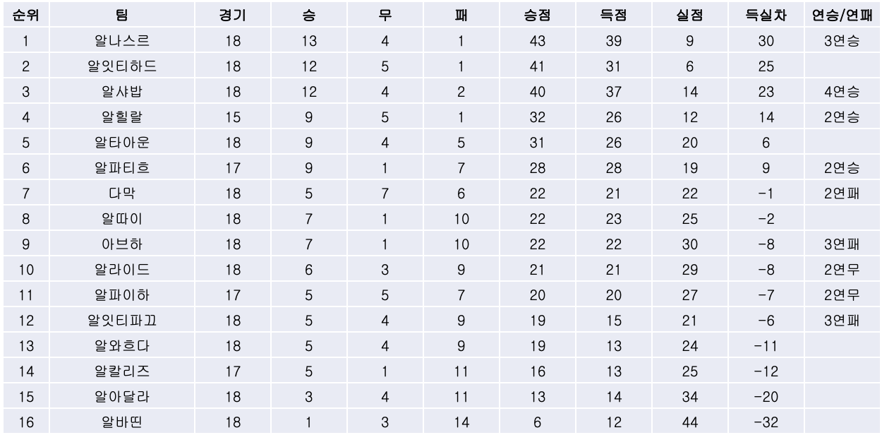 5) 강등권 탈출을 위한 승점이 필요했던 15위 알아달라와 14위 알칼리즈와의 경기에선 알아달라가 2대0으로 승리하며 여섯 경기 만에 승점 3점을 챙기며 알칼리즈와의 승점차를 6점차에서 3점차로 좁히는데 성공했습니다.