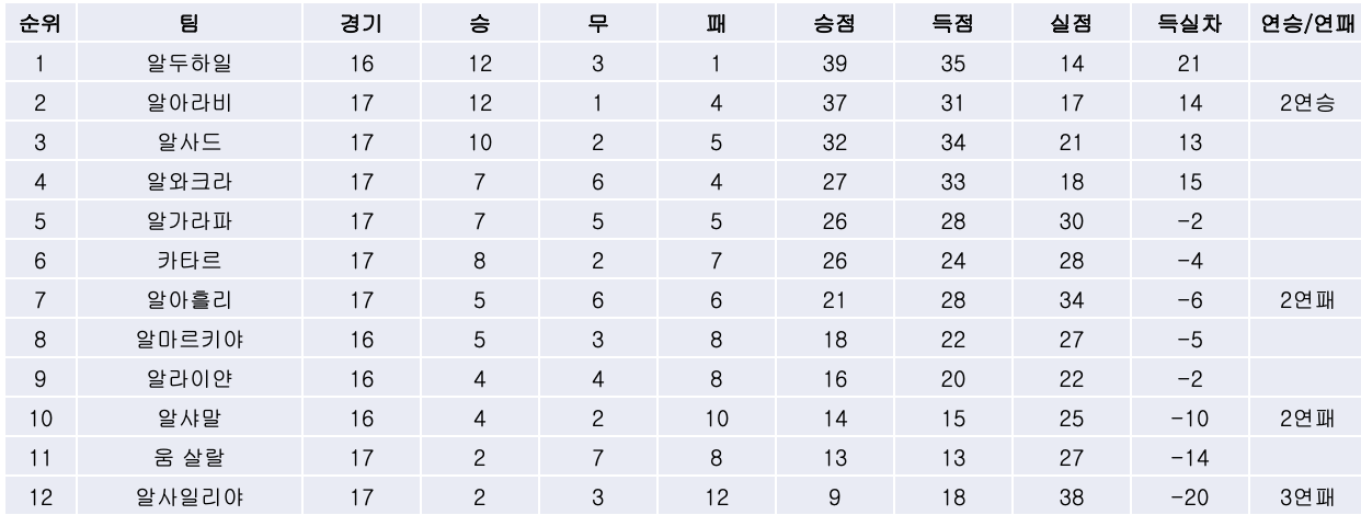 5) 강등권에서 완전히 벗어나고싶은 10위 알라이얀과 8위 알마르키야와의 경기에서는 다섯골을 주고받는 공방전 끝에 제이슨 바르가스의 역전 결승골을 앞세운 알라이얀이 2대3 승리를 거두고 전반기의 패배를 설욕하면서 승점을 2점차로 따라 붙으며 순위로 9위로 끓어올렸습니다.