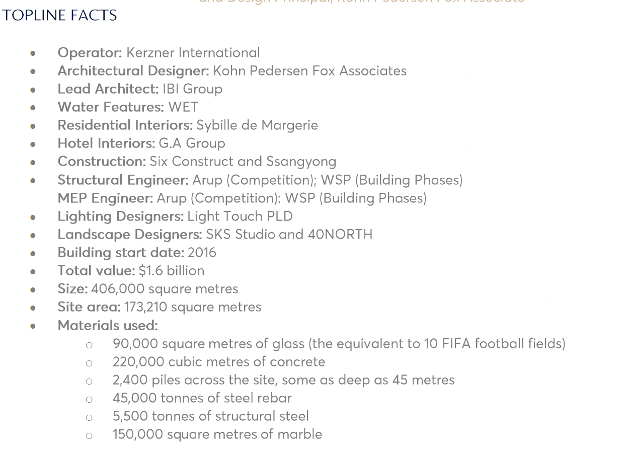호텔 3개동과 레지던스 3개동의 6개동으로 이뤄진 호텔&레지던스로 795객실을 갖춘 호텔의 최고층은 44층 (185m), 231세대로 구성된 레지던스의 최고층은 37층 (165m) 건물이며 비정형으로 만든 것이 특징입니다. 설계사인 뉴욕의 Kohn Pedersen Fox Associates에 따르면 이 독특한 건물 컨셉은 "상징적인 타워 (Iconic concept)"가 갖고 있는 기존 개념과 급성장하고 있는 도시의 스카이 라인 형성에 끼치는 역할을 재고하면서 시작되었다고 설명합니다. 초고층 건물의 외형에 초점을 맞추기 보다는 실내외 생활의 개념을 확장시키는 것에 초점을 잡아 가로 길이 500미터, 높이 185미터의 건물을 사람, 빛, 공기를 투과하는 투과성 스크린으로 활용할 수 있도록 설계했다고 하네요.