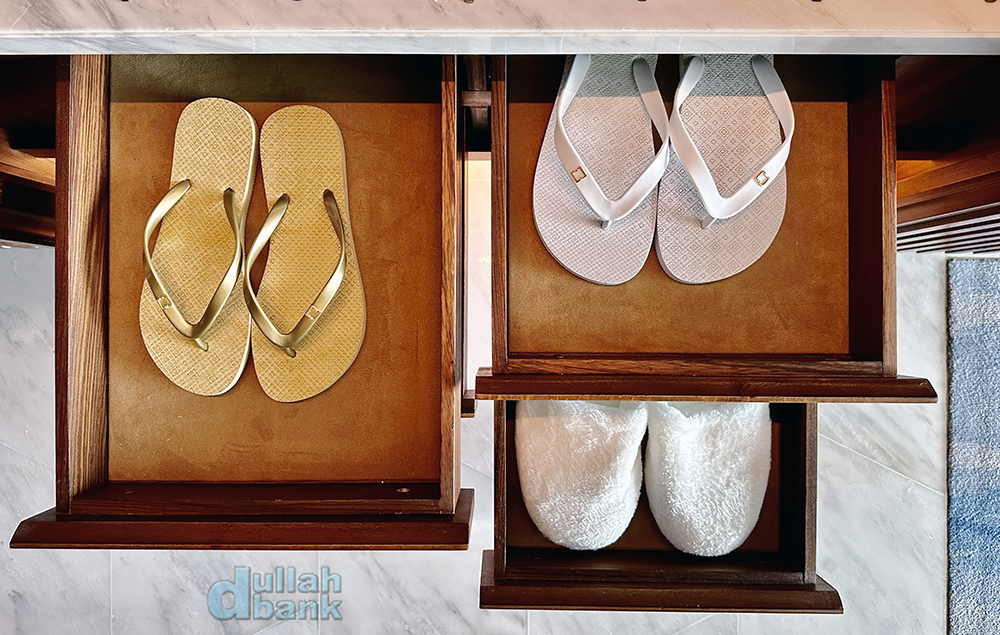 신발장에는 슬리퍼와 쪼리가 각각 두 쌍씩 구비되어 있습니다. 슬리퍼는 같은 색, 쪼리는 각기 다른 색. 두바이 호텔들이 아무리 풀과 바다를 끼고 있어도 쪼리 인심은 박한 편인데, 서로 다른 색상의 쪼리를 구비해둔 것은 맘에 들었습니다.
