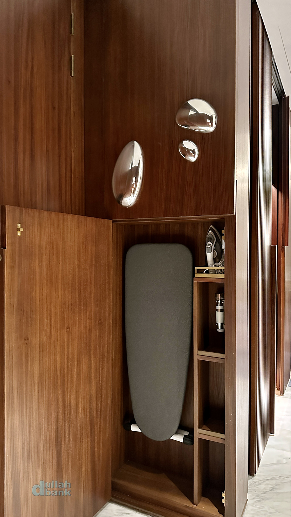 여닫이문이 달려 있어 다림질 용품이 수납되어 있습니다.