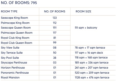 아틀란티스 더 로열은 총 795 객실로 이루어져 있습니다. 가장 싼 씨스케이프 룸부터 파노라믹 펜트하우스까지는 바로 예약 페이지에서 예약이 가능하지만,