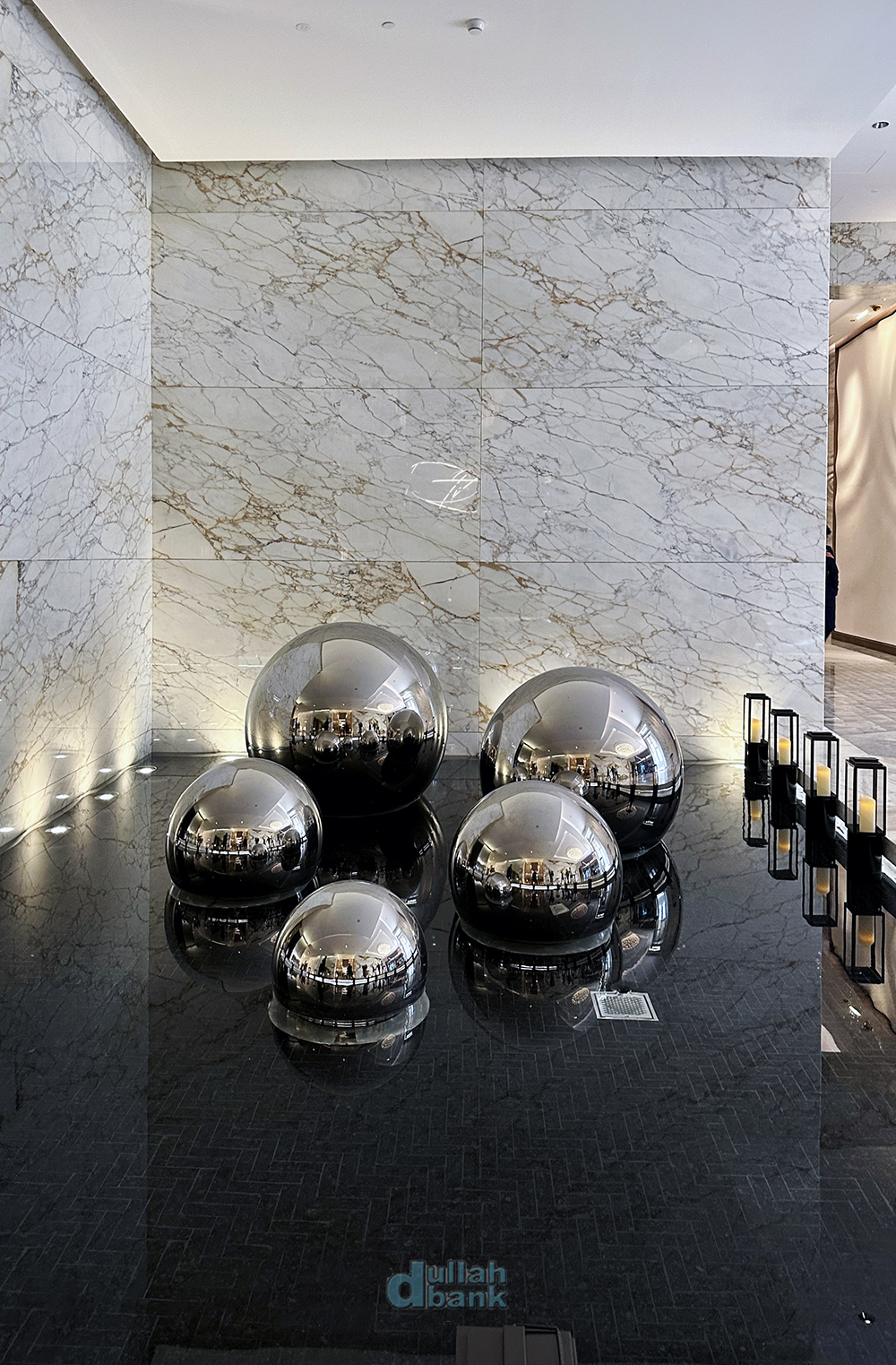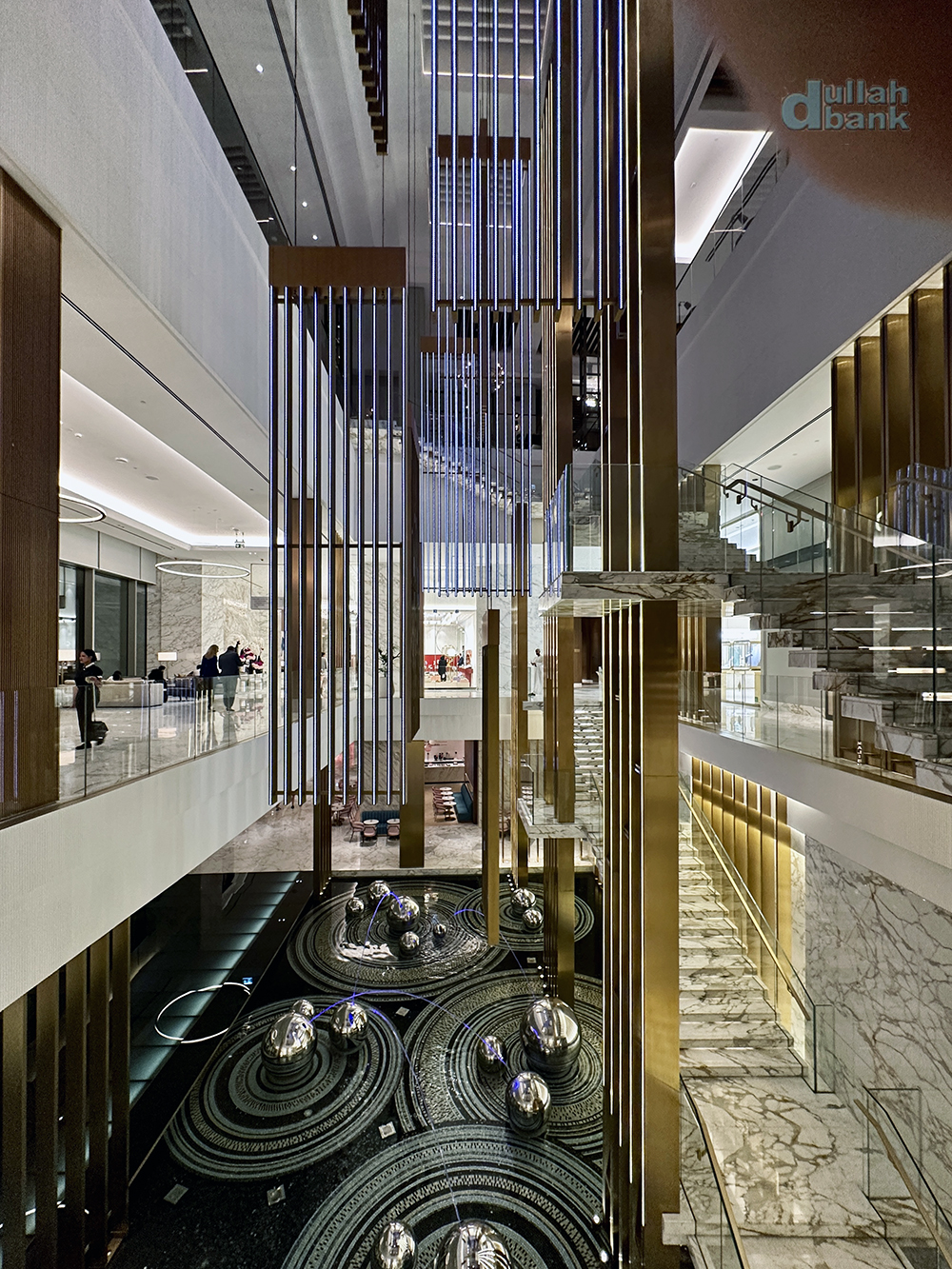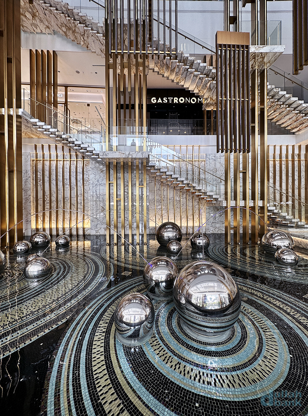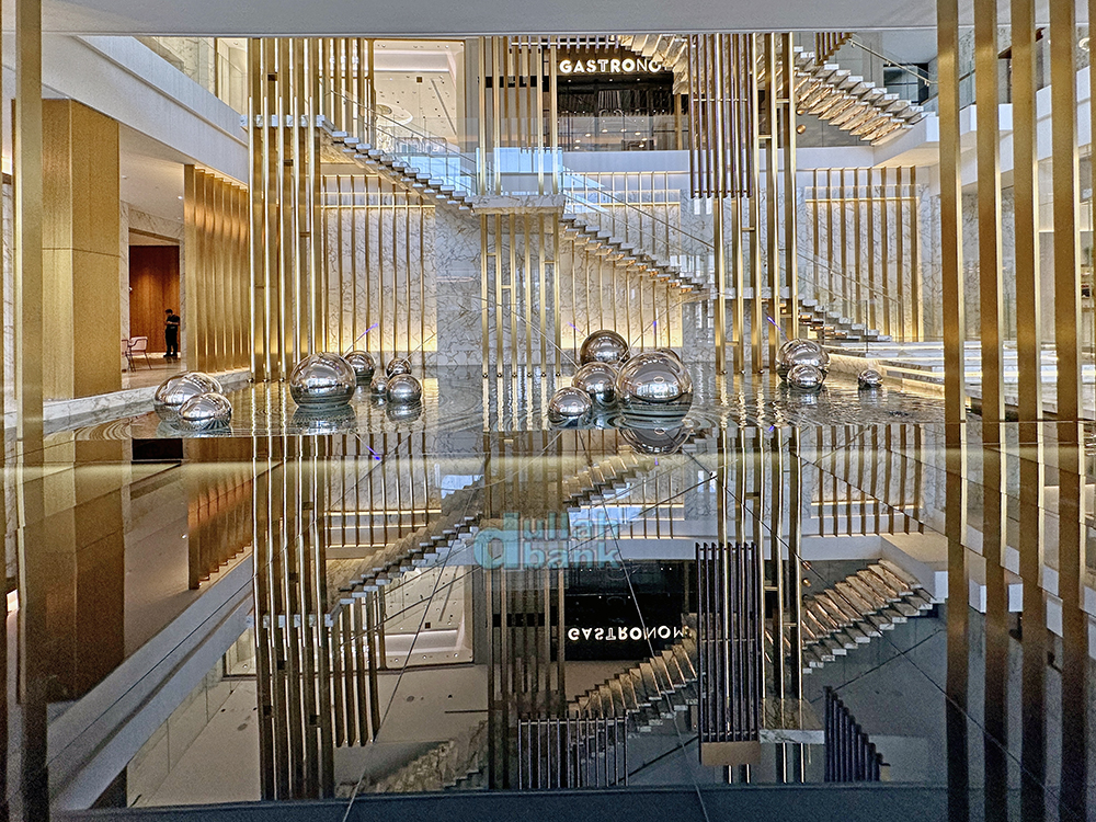 갤러리아 일대에 있는 계단 주위는 플로팅 계단, 수직 조형물, 공, 물의 반사 등을 활용해 단순한 계단이 아닌 하나의 예술작품처럼 보입니다.