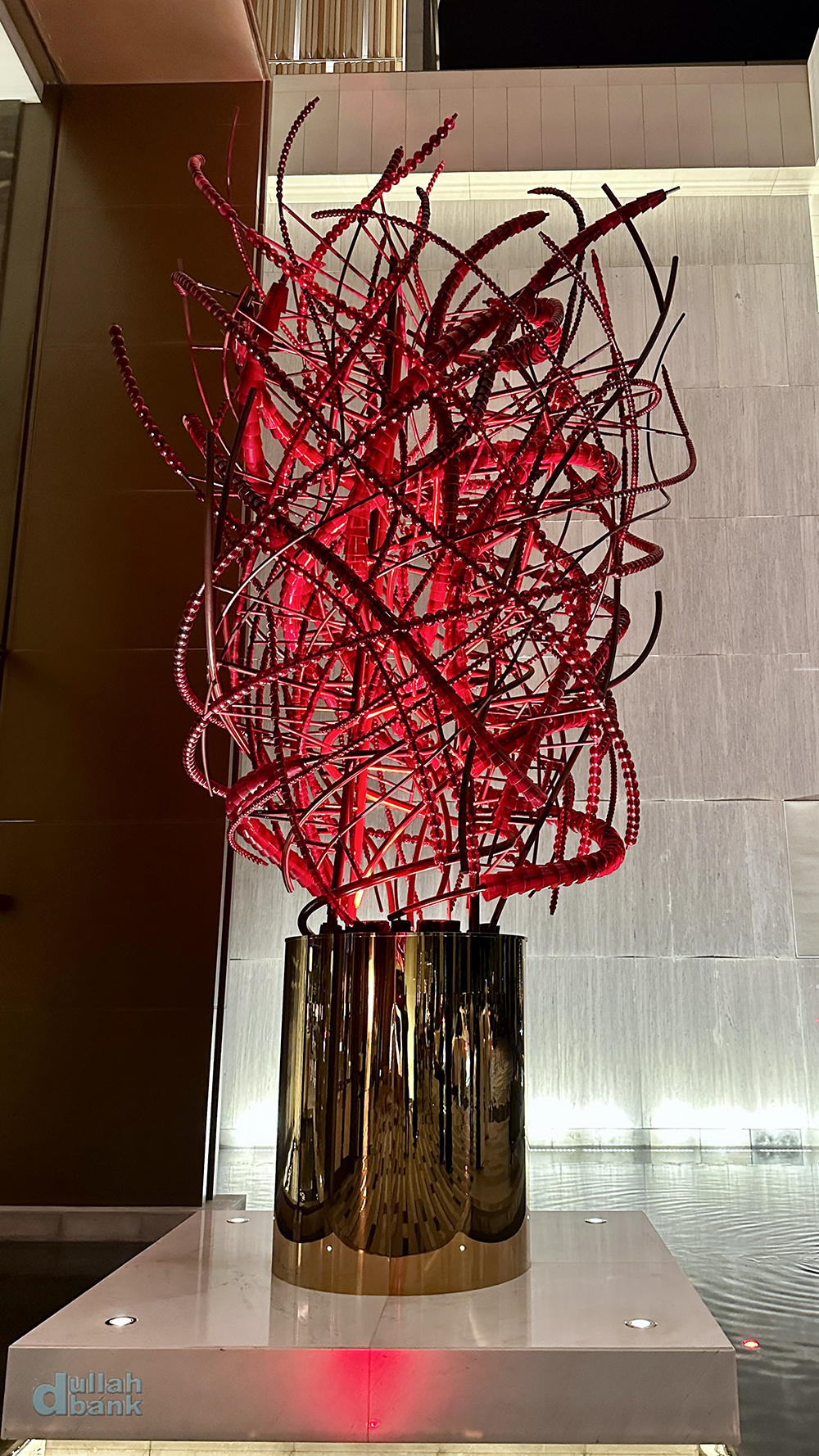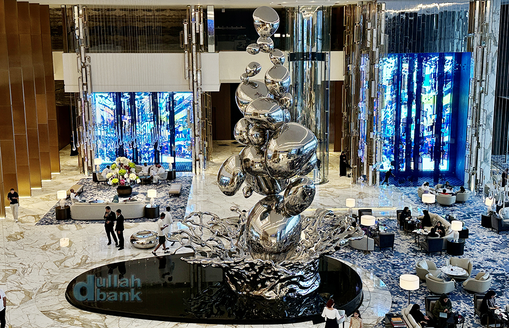 리조트 안에 들어와 방문객을 처음 맞이하는, 그리고 아틀란티스 컨셉과는 애시당초 거리를 두었음을 보여주는 높이가 약 11미터인 이 조형물의 이름은 "Droplet (작은 물방울)"으로 (더 팜 로비 중앙에 있는 조형물보다도 훨씬 작습니다...^^) 빗방울이 사막 위에 떨어지고 튀는 순간을 형상화했다고 합니다. 바닥이 사막 대신 물이긴 하지만요.