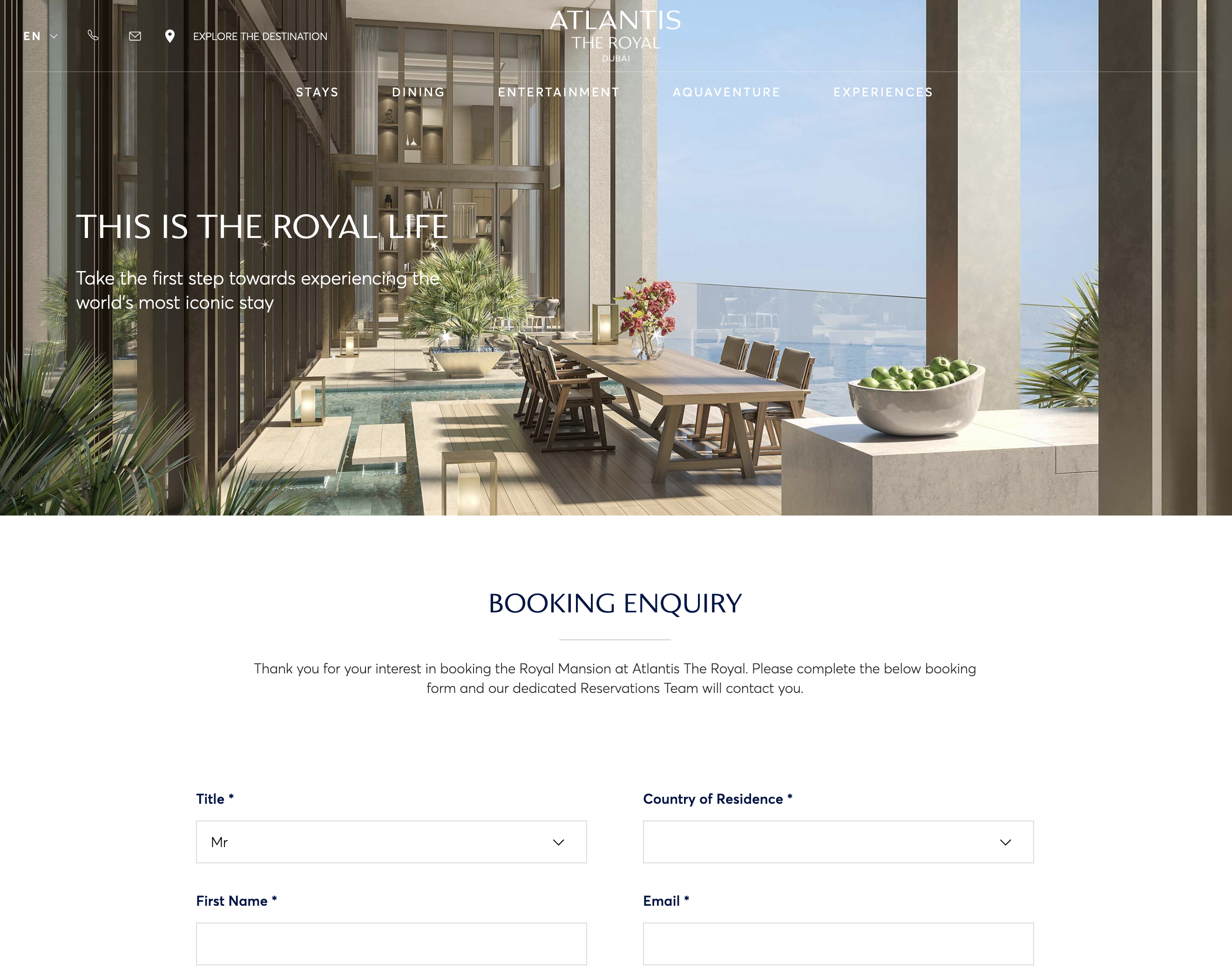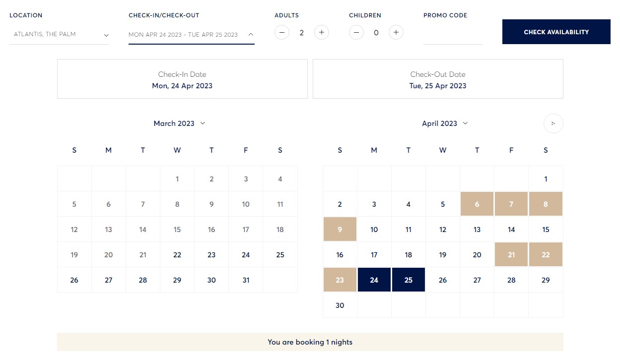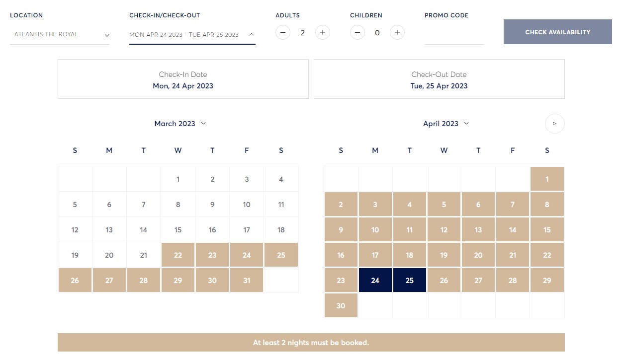 아틀란티스 더 로열은 무조건 최소 2박은 묵어야 예약이 가능합니다.