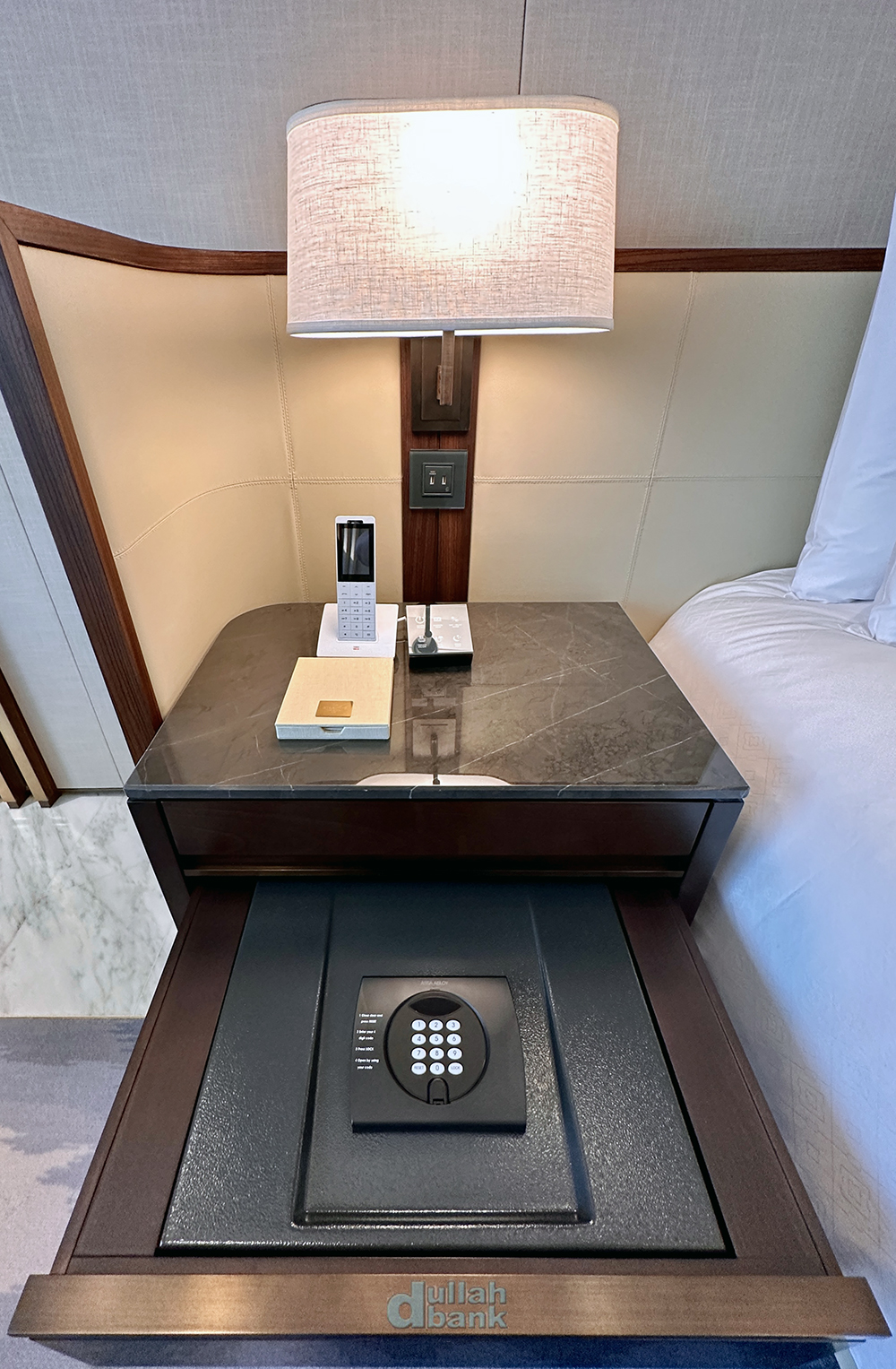 지금까지 눈에 띄지 않아 어디있나 싶었던 세이프티 박스는 옷장이 아닌 침대 협탁의 서랍 안에 있습니다.