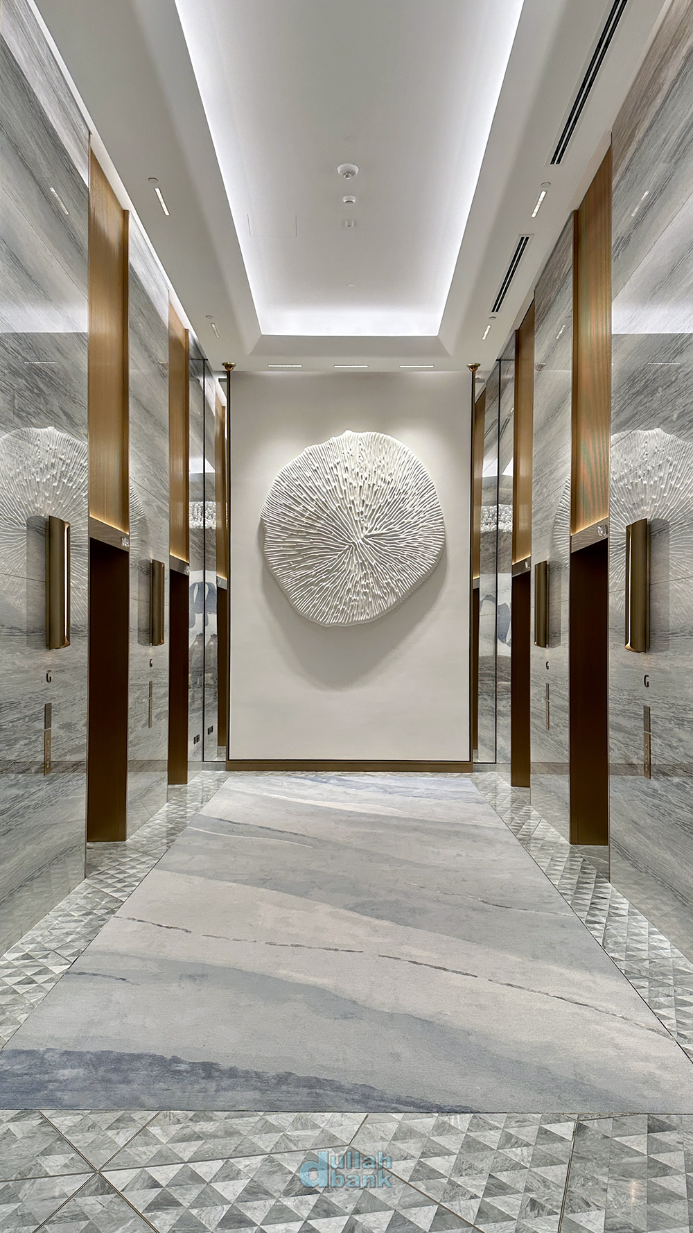 엘리베이터 로비로 가게되면 각 타워마다 이용할 수 있는 6대의 엘리베이터와 서로 다른 벽면의 조형물을 마주하게 됩니다.