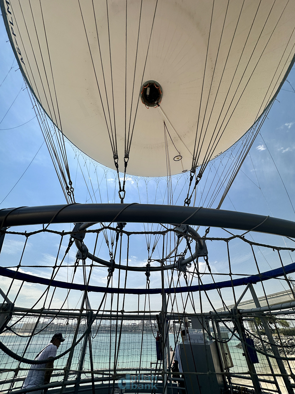 두바이 벌룬을 타고 팜 주메이라 상공으로 올라갑니다. 운항 시간은 1회당 총 10분 정도. 안전을 위해 이착륙 시에는 손잡이를 잡아야 하고, 운항 중 취식 및 흡연은 당연히 금지됩니다.