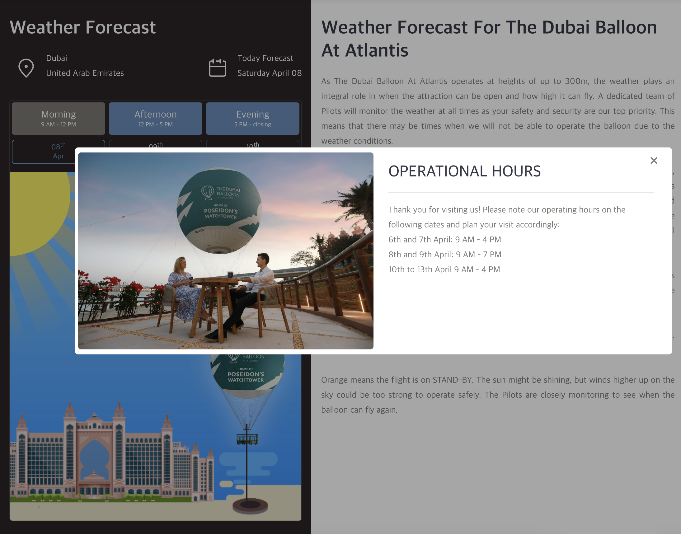 매표소 직원의 말에 의하면 날씨의 영향을 많이 받다 보니 두바이 벌룬을 이용하기 가장 좋은 계절은 UAE 내 여느 야외 시설과 달리 여름이라고 합니다. 바람이 전혀 불지 않는 계절이다 보니 운항이 취소될 확률도 거의 없고, 날씨가 뜨거운 대신 동절기와 달리 밤 11시까지 야간개장을 할 계획이라고 하니까요. 이번에 경험한 것처럼 운항 일정이 그야말로 복불복인 동절기의 경우 상대적으로 오전 시간대를 권장하고 있습니다. 실제로 일주일 동안 지켜보니 위에서 언급했던 것처럼 그나마 오전 시간대 (9시~12시)에만 운항할 정도로 말이죠.