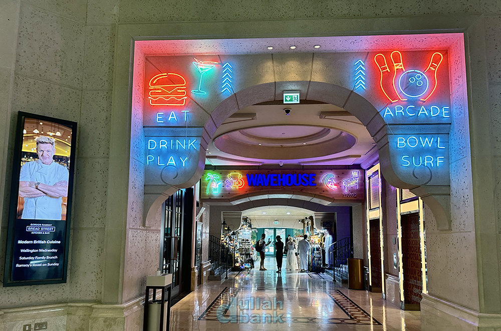 통로를 따라 걷다 보면 고든 램지의 사진이 걸려 있는 브레드 스트리트 키친&바와 그 모퉁이 공간을 일부 활용한 스트리트 피자 안내 스크린이 나오는데, 이 스크린을 보고 왼쪽으로 가면 아쿠아벤처 워터파크 매표소, 직진하면 두바이 벌룬 탑승장으로 연결됩니다.