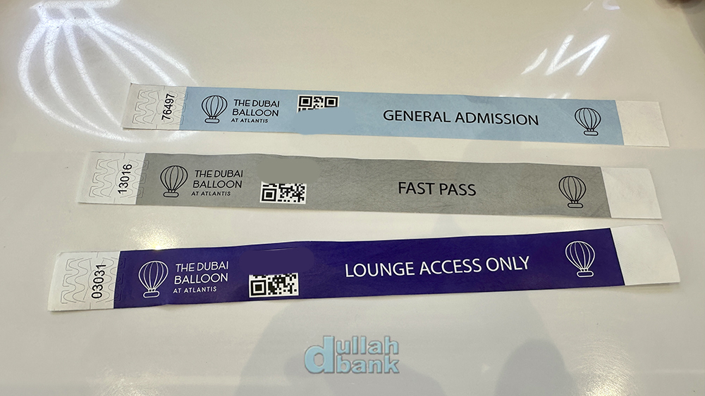 매표소에 가면 구매한 티켓을 확인하고 티켓에 따른 손목 밴드를 줍니다. 세 종류의 티켓이 있는데, 현재는 일반 티켓과 패스트 패스만 운영 및 판매하고 있습니다. 패스트 패스는 대기시간 단축 및 라운지에서 무료 음료가 제공됩니다.