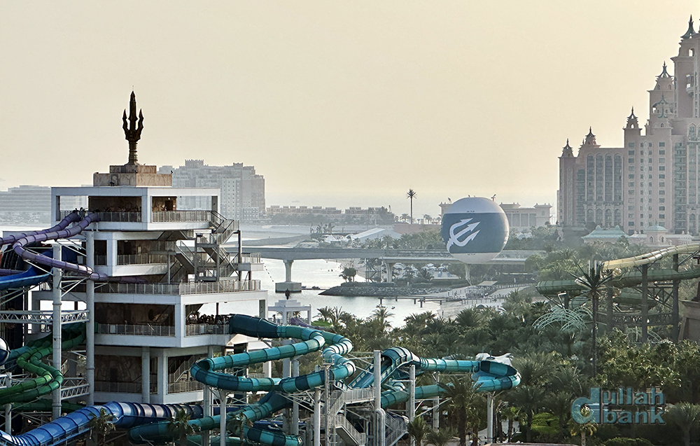 하늘에서 보는 아쿠아벤처 워터파크, 아틀란티스 더 로열, 수평선에 걸쳐 보이는 부르즈 알아랍과 부르즈 칼리파의 모습도 볼 수 있고...