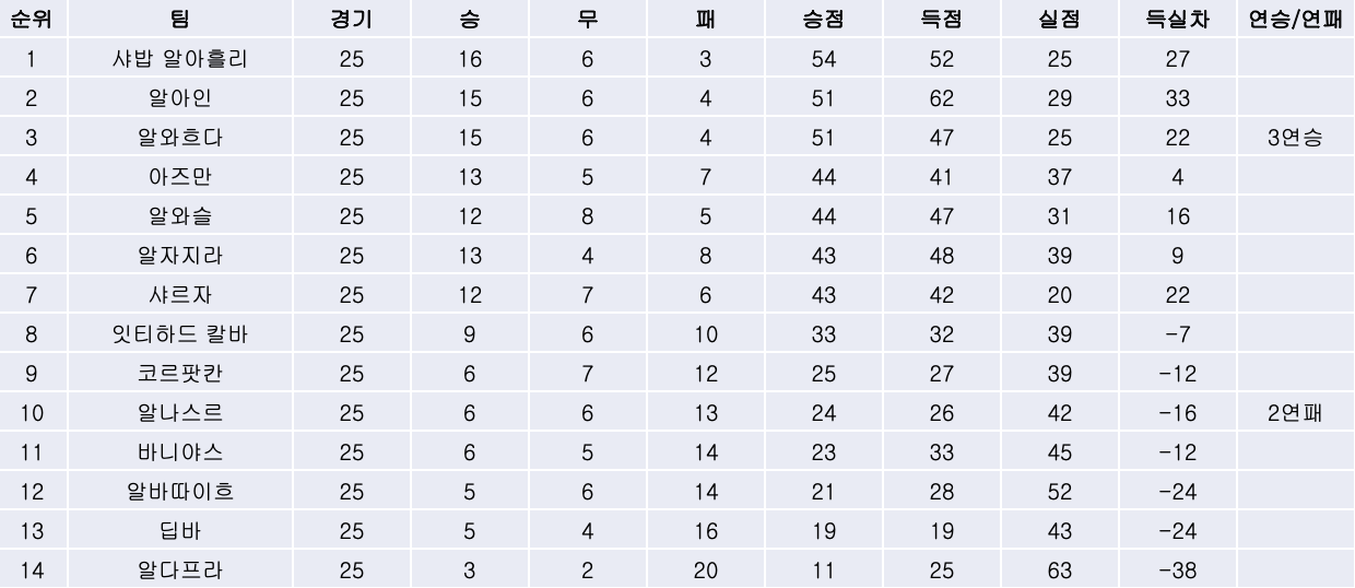 10) 샤밥 알아흘리가 우승을 확정지음에 따라 마지막 라운드에서는 강등을 피하려는 승격팀 동지 알바따이흐와 딥바의 생존 경쟁만이 남았습니다. 2부 리그에서는 핫타가 승격을 확정지은 가운데 에미레이츠 클럽, 딥바 알호슨이 1부 리그 승격을 위해 경쟁 중입니다.