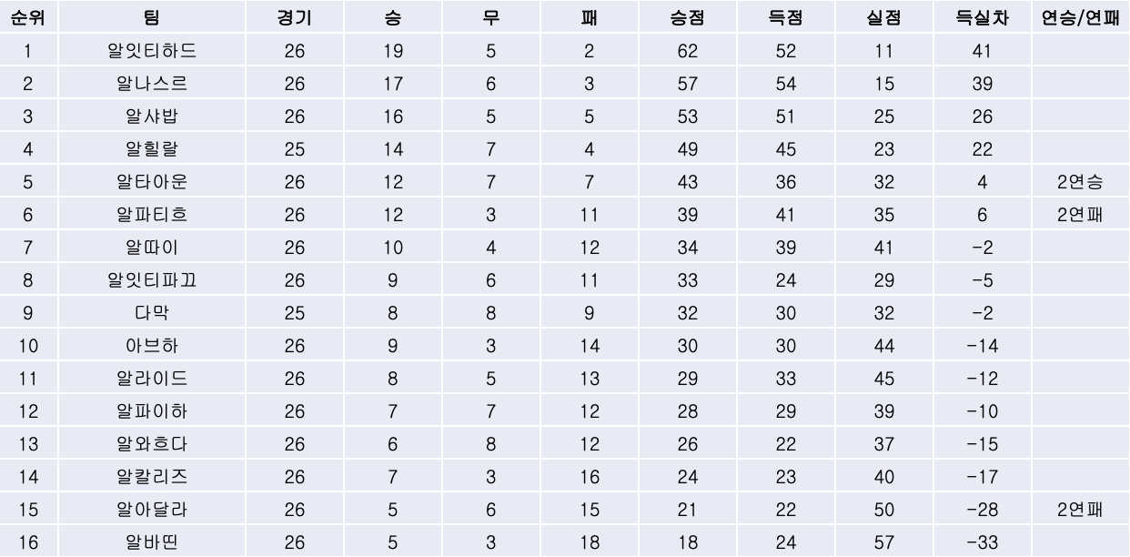 4) 최근 3경기에서 1승 1무 1패로 부진하며 선두를 빼앗은 알잇티하드와의 승점차를 좀처럼 좁히지 못하고 있는 알나스르는 강등 경쟁 중인 알칼리즈와의 경기에서 간신히 1대1 무승부를 거두면서 승점 3점 확보에 실패했습니다. 호날두는 별다륺 활약을 펼치지 못하며 2연승에 실패했습니다.
