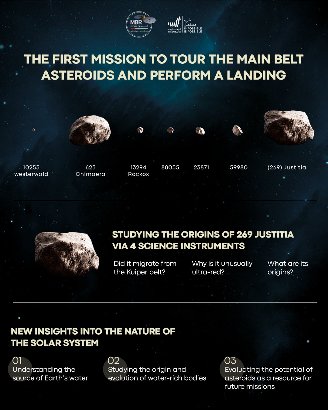 UAE의 소행성대 탐사 미션은 2028년 셰이크 무함마드 빈 라쉬드 부통령의 이름을 따 명명한 MBR 익스플로러 (Mohammed Bin Rashid Explorer)를 2028년 3월 중에 발사하는 것으로 시작됩니다. 거대한 접이식 태양광 판넬을 장착한 2.3톤의 무인 우주선 MBR 익스플로러는 소행성 저스티티아 269까지 "다양한 구성 유형을 가진 다양한 등급의 소행성"을 대표하는 7개의 소행성 탐사를 위해 지구에서 소행성대까지 시속 33,000km의 속도록 50억km를 여행하여 목표로 삼은 7개의 소행성을 고도 150km 상공까지 접근하여 통과한 후