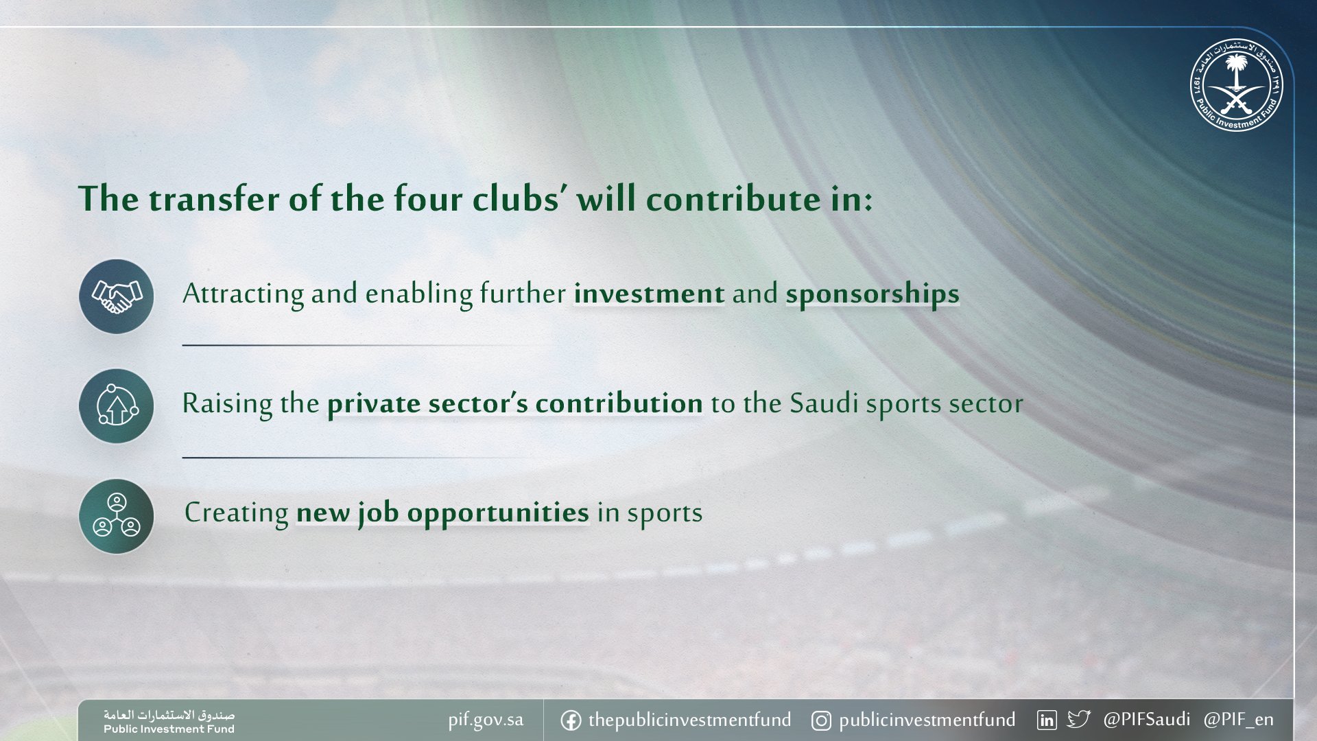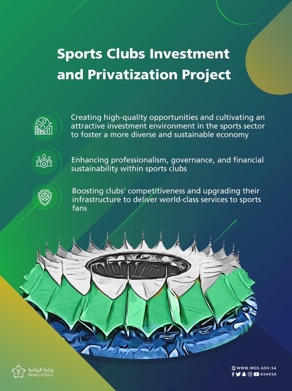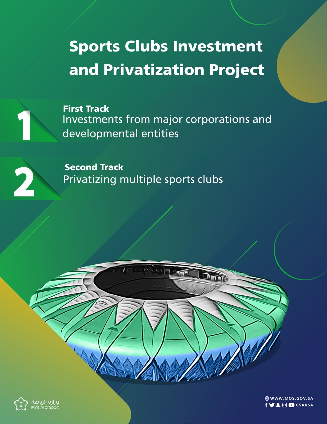 비전 2030의 일환으로 발표된 이번 프로젝트는 스포츠 클럽의 기술적인 수준, 행정 및 재정적인 관리 능력을 종합적으로 발전시켜 자국 클럽들과 국가대표의 수준을 세계적인 수준으로 끌어올리기 위해 민간 부문의 투자를 적극적으로 유치하기 위한 조치입니다.