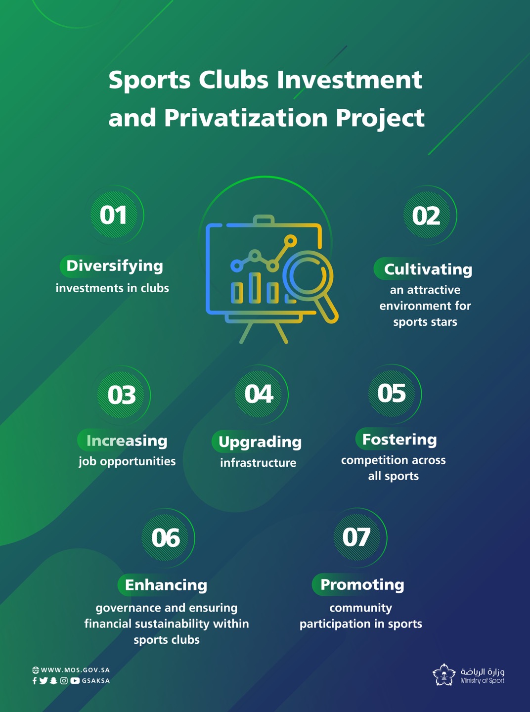비전 2030의 일환으로 발표된 이번 프로젝트는 스포츠 클럽의 기술적인 수준, 행정 및 재정적인 관리 능력을 종합적으로 발전시켜 자국 클럽들과 국가대표의 수준을 세계적인 수준으로 끌어올리기 위해 민간 부문의 투자를 적극적으로 유치하기 위한 조치입니다.