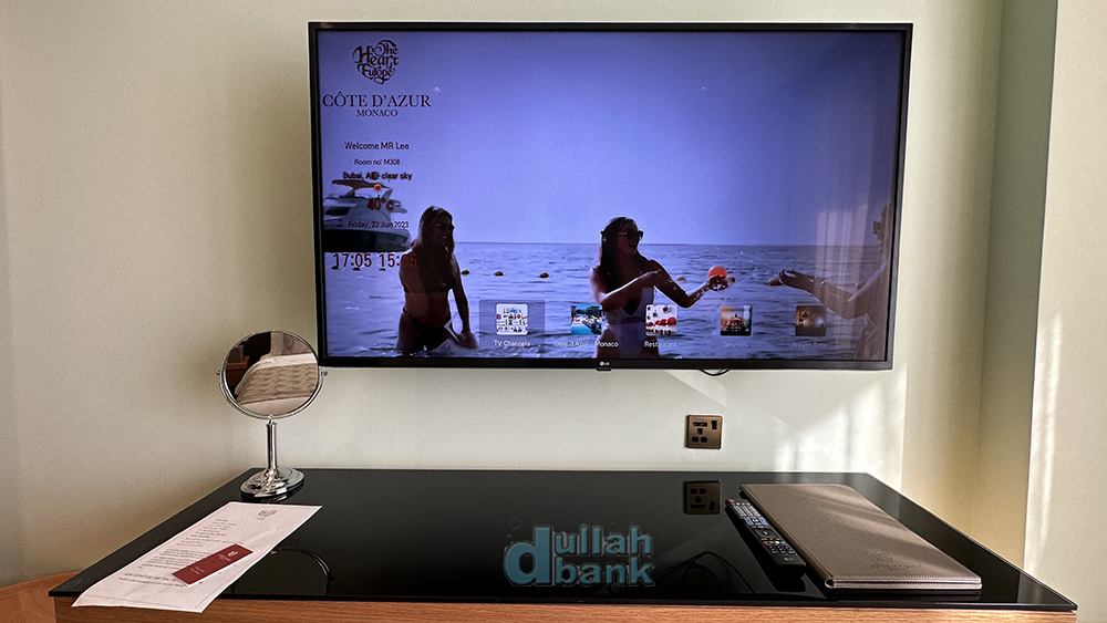 벽걸이형 TV와 테이블. 한국 방송은 안 나옵니다.