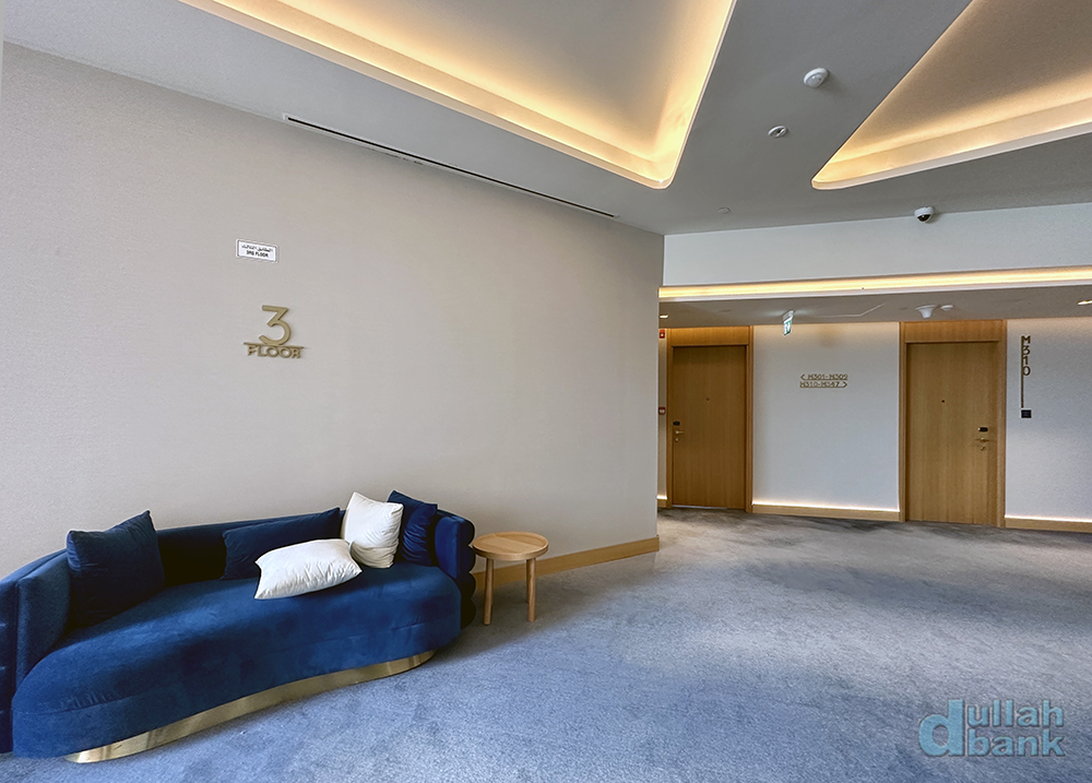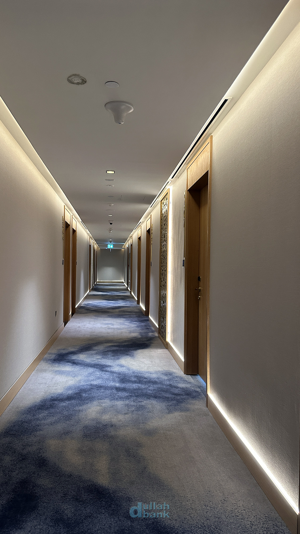 통로는 무난한 디자인이며, 바닥에는 해변가에 있는 호텔들의 트렌드인 푸른색 계열의 카펫이 깔려 있습니다.