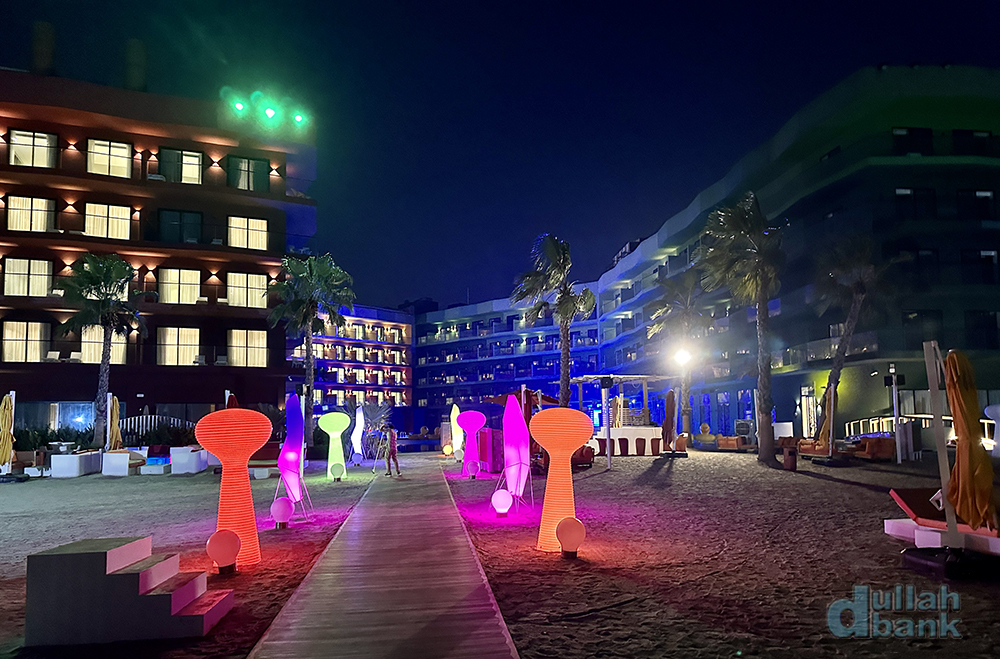 DJ 부스는 해변과 야외수영장 사이, 호텔 건물과 건물 사이의 초입에 있습니다.