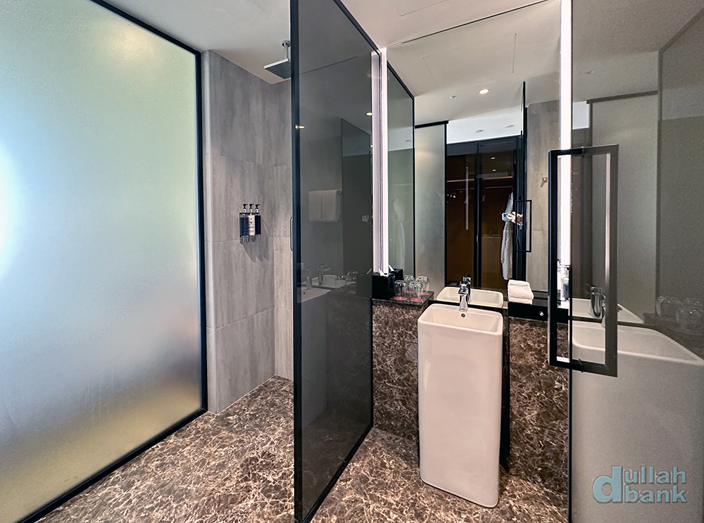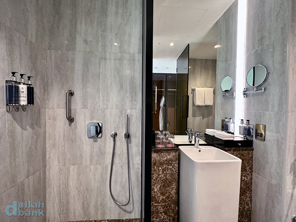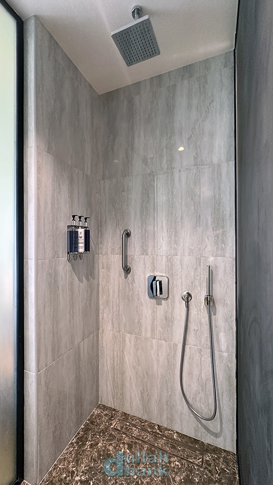 샤워실은 일반 샤워와 천장 샤워 두 가지를 지원하며 수압도 좋은 편입니다.